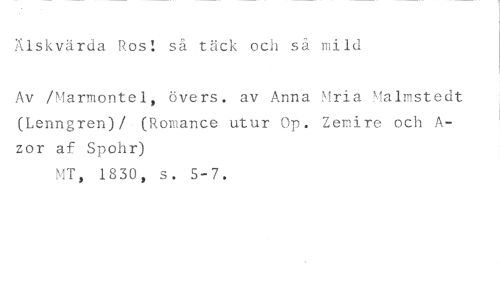 Älskvärda Ros! så täck och så mild //// Av /Marmontel, övers. av Anna Mria Malmstedt (Lenngren)/ (Romance utur Op. Zemire och Azor af Spohr) //// MT, 1830, s. 5-7.