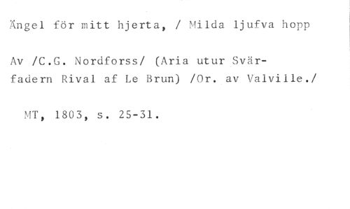 Ängel för mitt hjerta, / Milda ljufva hopp //// Av /C.G. Nordforss/ (Aria utur Svär- //// fadern Rival af Le Brun) /Or. av Valville. //// /1803, s. 25-31.