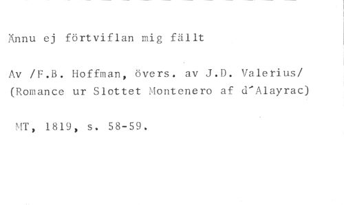 Ännu ej förtviflan mig fällt //// Av /F.B. Hoffman, övers. av J.D. Valerius/ (Romance ur Slottet Montenero af d'Alayrac) //// MT, 1819, s. 58-59.