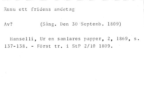 Ännu ett fridens andetag //// Av? (Sång. Den 30'Septemb. 1809) //// Hanselli, Ur en samlares papper, 2, 1869, s. 137-138. - Först tr. i StP 2/10 1809.