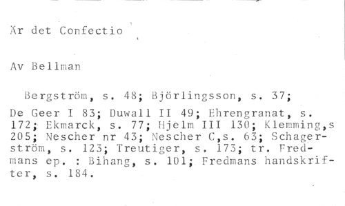 Är det Confectio //// Av Bellman //// Bergström, s. 48; Björlingsson, s. 37; //// De Geer I 83; Duwall II 49; Ehrengranat, s. 172; Ekmarck, s. 77; Hjelm III 130; Klemming,s 205; Nescher nr 43; Nescher C,s. 63; Schagerström, s. 123; Treutiger, s, 173; tr. Fredmans ep. : Bihang, s. 101; Fredmans handskrifter, s. 184.