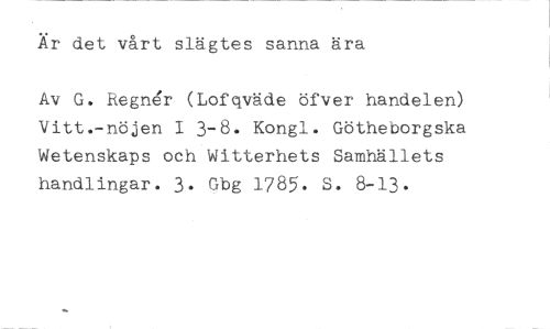 Är det vårt slägtes sanna ära //// Av G. Regner (Lorciväde öfver bandelen} Vitt.-nöjen I 3-8. Kongl. Götheborgska Wetenskaps och Witterhets Samhällets handlingar. 3. Gbg 1785. S. 8-13.