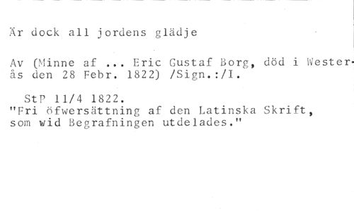 Är dock all jordens glädje //// Av (Minne af .,. Eric Gustaf Borg, död i Wester-ås den 28 Febr. 1822) /Sign.:/I. //// StP 11/4 1822. //// "Fri öfwersättning af den Latinska Skrift, som vid Begrafningen utdelades."