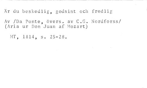 Är du beskedlig, godsint och fredlig //// Av /Da Ponte, övers. av C.G. Nordforssl (Aria ur Don Juan af Mozart) //// MT, 1814, s. 25-28.