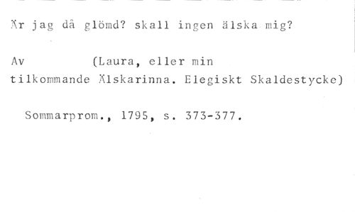 Är jag då glömd? skall ingen älska. mig? //// Av (Laura, eller min //// tilkommande Älskarinna. Elegiskt Skaldestycke) //// Sommarprom., 1795, s. 373-377.