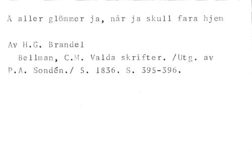 Å aller glömmer ja, når ja skull fara hjem //// Av H.G. Brandel //// Bellman, C.M. Valda skrifter. /Utg. av P.A. Sond6n./ 5. 1836. S. 395-396.