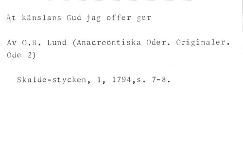 At känslans Gud jag offer ger //// Av O.B. Lund (Anacreontiska Oder. Originaler. Ode 2) //// Skalde-stycken, 1, 1794,s. 7-8.