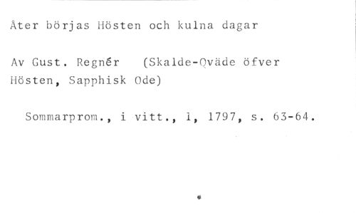 Åter börjas Hösten och kulna dagar //// Av Gust. Regn6r (Skalde-Qväde öfver //// Hösten, Sapphisk Ode) //// Sommarprom., i vitt., 1, 1797, s. 63-64.
