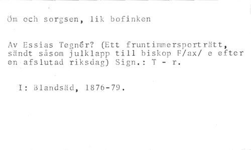 Öm och sorgsen, lik bofinken //// Av Essias Tegnér? (Ett fruntimmersporträtt, sändt såsom julklapp till biskop F/ax/ e efter en afslutad riksdag) Sign.: T - r. //// I: Blandsäd, 1876-79.