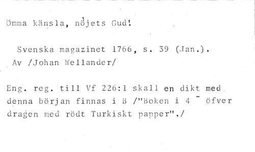 ömma känsla, nöjets Gucg //// Svenska magazinet 1766, s. 39 (Jan.). Av /Johan Wellander //// /Eng. reg. till Vf 226:1 skall en dikt med denna början finnas i B /"Boken i 4 - öfver dragen med rödt Turkiskt papper". //// /