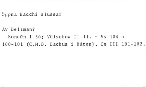 Öppna Bacchi slussar //// Av Bellman? //// Son(16n I 56; Völschow II 11. - Vs 104 b 100-101 (C.M.B. Bachus i Båten). Cn III 101-102.