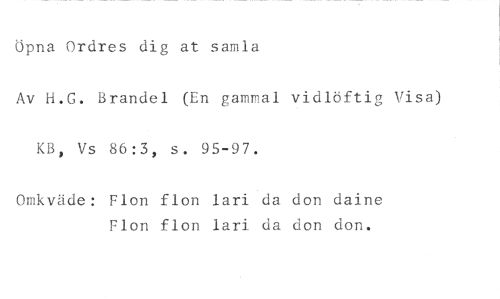 Öpna Ordres dig at samla //// Av H.G. Brandel (En gammal vidlöftig Visa) KB, Vs 86:3, s. 95-97. //// Omkväde: Flon flon lari da don daine Flon flon lari da don don.
