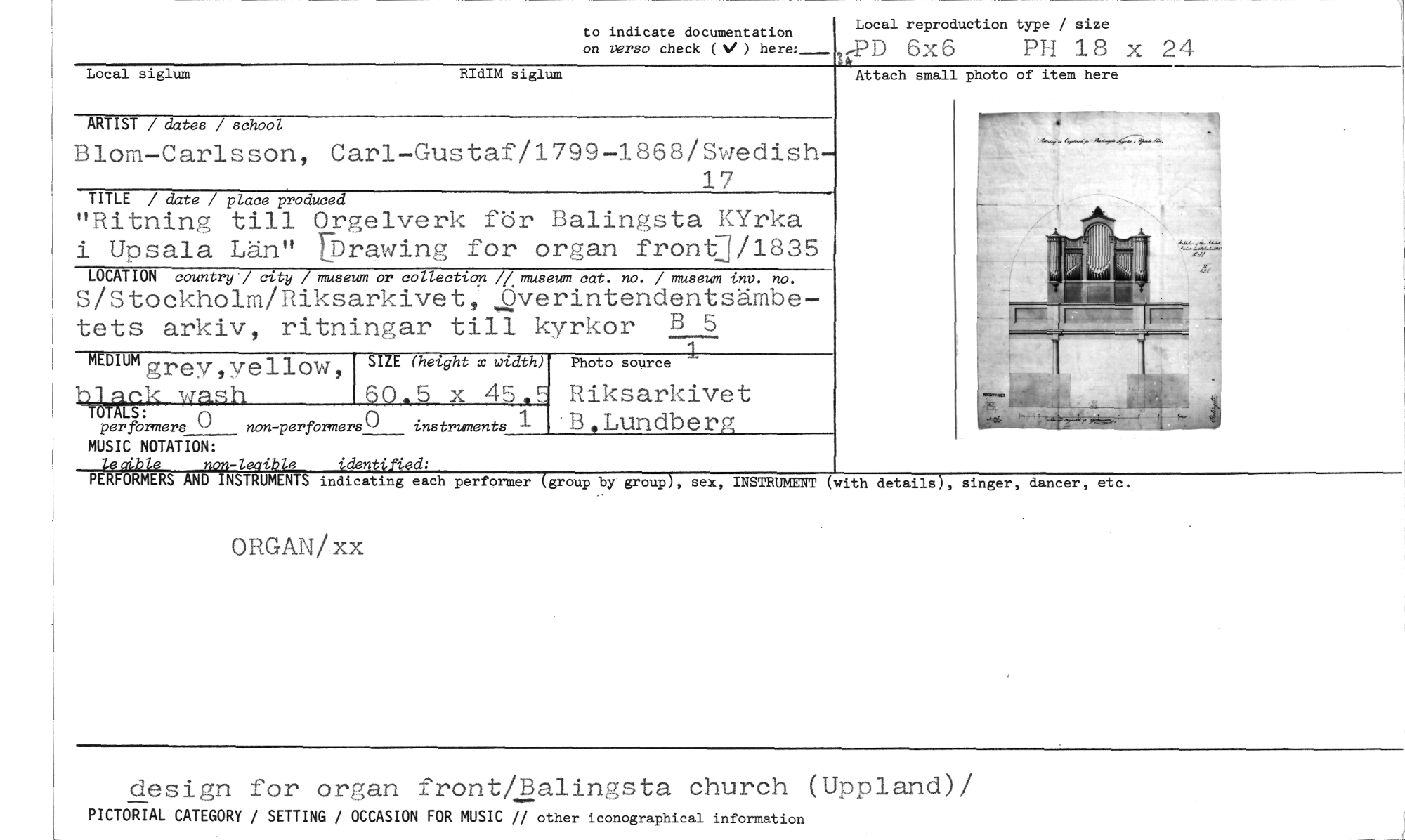 //// to indicate documentation //// on verso check ( %I ) here,___ //// Local reproduction type / size //// 1..-PD 6x6 PH 18 x 24 //// Local siglum RIdIM siglum //// ARTIST / dates / school //// Blom-Carlsson, Carl-Gustaf/1799-1868/Swedish- //// 17 //// TITLE / date / place produced //// "Ritning till Orgelverk för Balingsta KYrka i Upsala Län" EDrawing for organ front7/1835 //// LOCATION country / city / museum or collection // museum cat. no. / museum inv. no. //// S/Stockholm/Riksarkivet, Overintendentsämbetets arkiv, ritningar till kyrkor B 5 //// 1 //// MEDIUM grey,vellow, //// • //// SIZE (height x width) //// •• 5 x 45 //// Photo source //// Riksarkivet B. Lundberg //// Attach small photo of item here //// 41 //// LS: //// perfbrmers. C) non-perfbrmers instrvnents 1 //// MUSIC NOTATION: //// t e 'den i-d; //// 41 //// PERFORMERS AND INSTRUMENTS indicating nach performer group by group • sex, INSTRUMENT (with details), singer, dancer, etc. //// ORGAN/ xx //// design for organ front/Balingsta church (Uppland)/ //// PICTORIAL CATEGORY / SETTING / OCCASION FOR MUSIC // other iconographical information ////