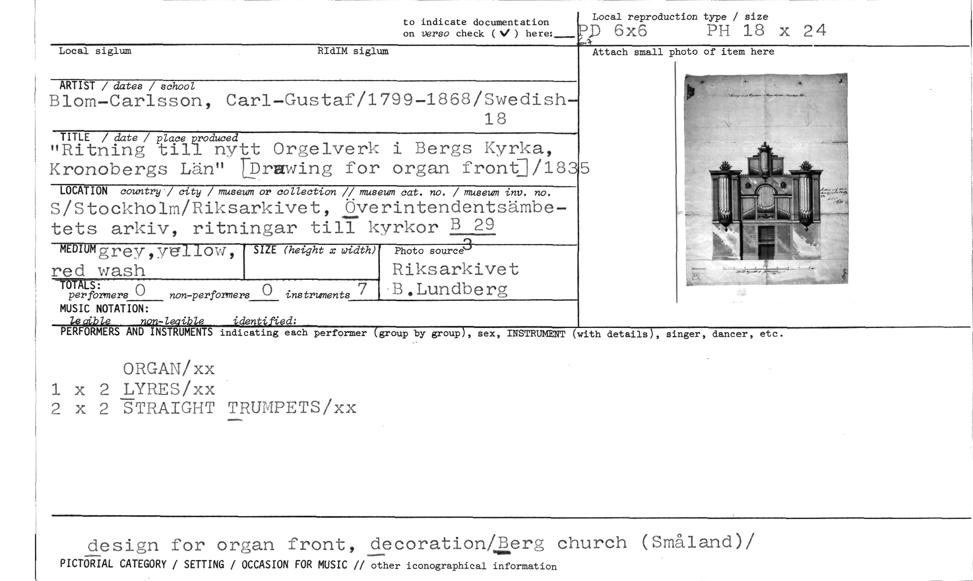 //// ORGAN/xx //// 1 x 2 LYRES/xx //// 2 x 2 TRAIGHT TRUMPETS/xx //// design for organ front, decoration/Berg church (Småland)/ //// PICTORIAL CATEGORY / SETTING / OCCASION FOR MUSIC // other iconographical information //// to indicate documentation //// on verso check (V ) here:___ //// Local~oductiontype/si. //// Pp 6x6 PH 18 x 24 //// Local siglum RIdIM siglum //// ARTIST / dates / school //// Blom-Carlsson, Carl-Gustaf/1799-1868/Swedish- //// 18 //// TITLE / date / plce2.2'°du'ed //// "Ritning till nytt Orgelverk i Bergs Kyrka, Kronobergs Län" Eprawing for organ front]/183 //// LOCATION country "/ city / museum or collection // museum cat. no. / museum 1.nv. no. //// S/Stockholm/Riksarkivet, överintendentsämbetets arkiv, ritningar till kyrkor B 29 //// SIZE (height x width) //// red wash //// 5 //// mmmgrey,Tellow, //// Photo source" //// Riksarkivet B.Lundberg //// Attack small photo of item here //// UTATS: //// perfbrmers () non-perförmers 0 instrument //// MUSIC NOTATION: //// oible non-leaible identified: //// PER ORMERS AND INSTRUMENTS indicating each performer (group by group), sex, INSTRUMENT (with details), singer, danser, etc. ////
