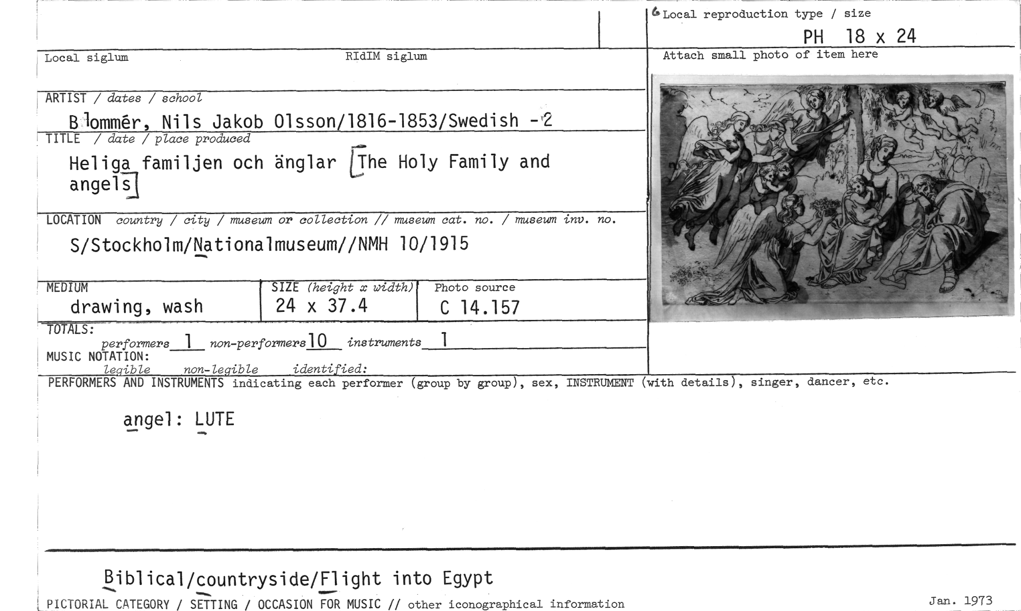 //// (with details), singer, dancer, etc. //// INSTRUMENT //// &Local reproduction type / size //// PH 18 x 24 //// Local siglum RIdIM siglum //// ARTIST / dates / school //// BlomMr, Nils Jakob Olsson/1816-1853/Swedish //// TITLE / date / place produced //// Heliga familjen och änglar (The Holy Family and angels] //// LOCATION country / city / museum or collection // museum cat. no. / museum inv. no. //// S/Stockholm/Nationalmuseum//NMH 10/1915 //// Attach small photo of item here //// MEDIUM //// drawing, wash //// SIZE (height x width) //// 24 x 37.4 //// Photo source //// C 14.157 //// -Tunws: //// performers 1 non -performers1 0 instruments 1 MUSIC NOTATION: Ze.ible non-le ible identi ied: PERFORMERS AND INSTRUMENTS indicating each performer (group by group), sex, //// angel: LUTE //// Biblical/countryside/Flight into Egypt //// PICTORIAL CATEGORY / SETTING / OCCASION FOR MUSIC // other iconographical information Jan. 1973 ////