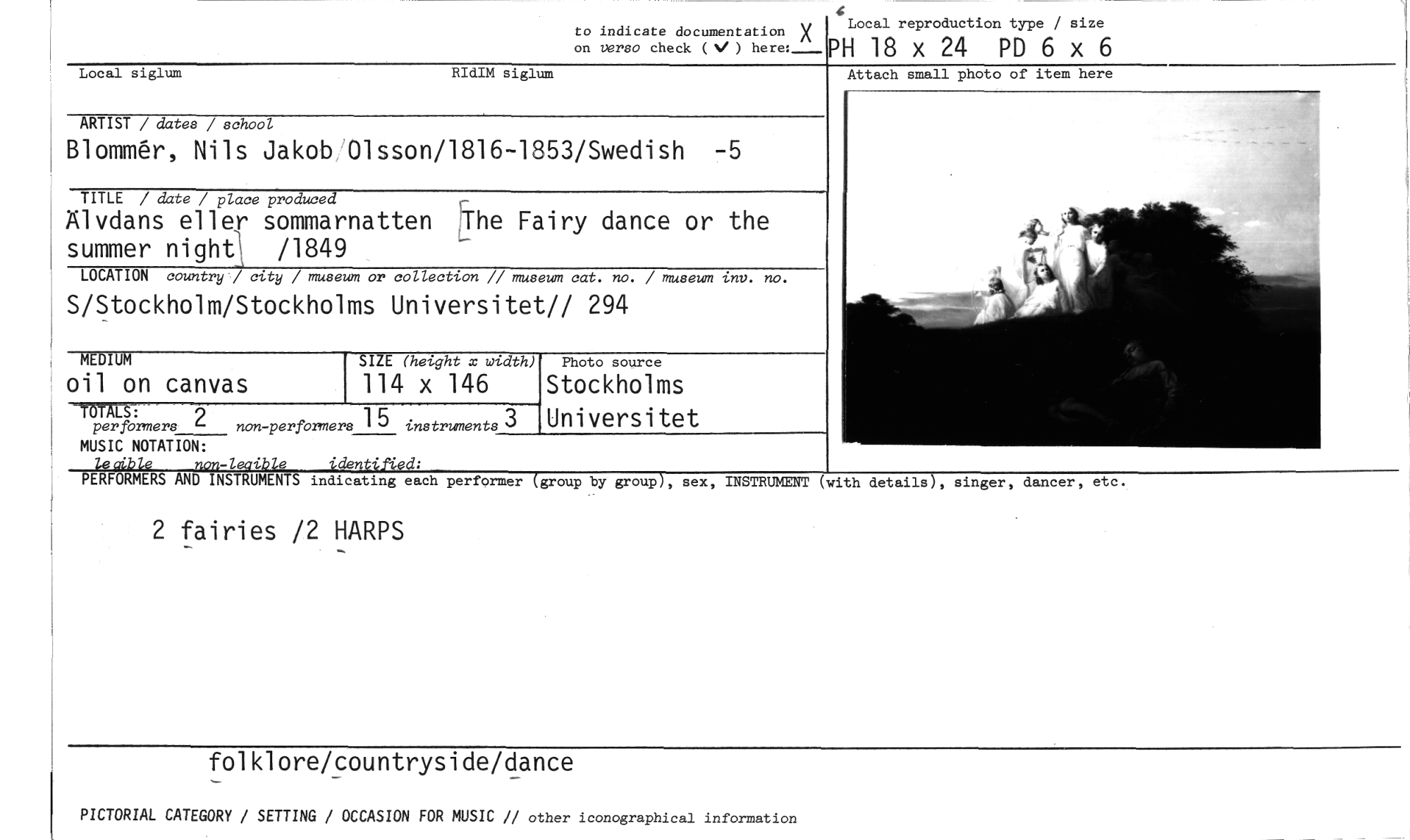 //// to indicate documentation X on verso check ( ) //// PH 18 x 24 PD 6 x 6 //// Local reproduction type / size //// Local siglum RIdIM siglum //// Attach small photo of item here //// ARTIST / dates / school //// Blommå'r, Nils Jakob Olsson/1816-1853/Swedish -5 //// TITLE / date / place produced //// Älvdans eller sommarnatten Fairy dance or the //// summer night},, /1849 //// LOCATION country -/ city / museum or collection // museum cat. no. / museum inv. no. //// S/Stockholm/Stockholms Universitet// 294 //// MUSIC NOTATION: //// leaible non-leaible identified: //// MEDIUM SIZE (height x width) //// oil on canvas 114 x 146 //// =AB 9 //// per fbrmers non-performers 15 instruments 3 //// Photo source //// Stockholms Universitet //// PERFORMERS AND INSTRUMENTS indicating each performer (group by group), sex, INSTRUMENT (with details), singer, dancer, etc. //// 2 fairies /2 HARPS //// folklore/countryside/dance //// PICTORIAL CATEGORY / SETTING / OCCASION FOR MUSIC // other iconographical information ////