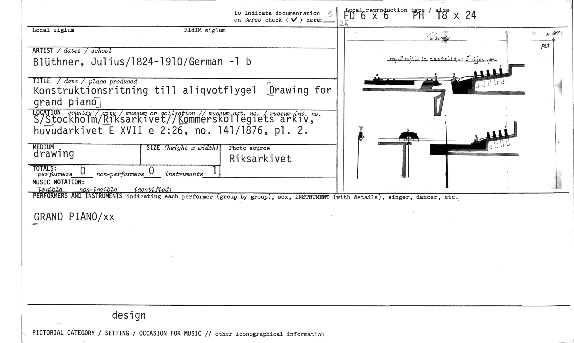 //// to indicate documentation //// on versa check (NI ) here:___ //// atrert""" tf te 24 //// Local siglum RIdIM siglum //// ARTIST / dates / school //// BlUthner, Julius/1824-1910/German -1 b //// TITLE / date / place produced //// Konstruktionsritning till alicivotflygel Irawing for grand pi anod, //// g)c/AMcnicrfrd/ktk/sägrjetlfg6iiiimegesrlcrg"-Veträr'W-Nr huvudarkivet E XVII e 2:26, no. 141/1876, pl. 2. //// Photo source //// Riksarkivet //// -TÖM: //// performers 0 non-performers 0 instruments //// MUSIC NOTATION: //// leGible non-logible identi.fied; //// munum drawi ng //// SIZE (height x width) //// PERFORMERS AND INSTRUMENTS indicating each performer (group by group), sex, INSTRUMENT (with details), singer, dancer, etc. //// GRAND PIANO/xx //// design //// PICTORIAL CATEGORY / SETTING / OCCASION FOR MUSIC // other iconographical information ////