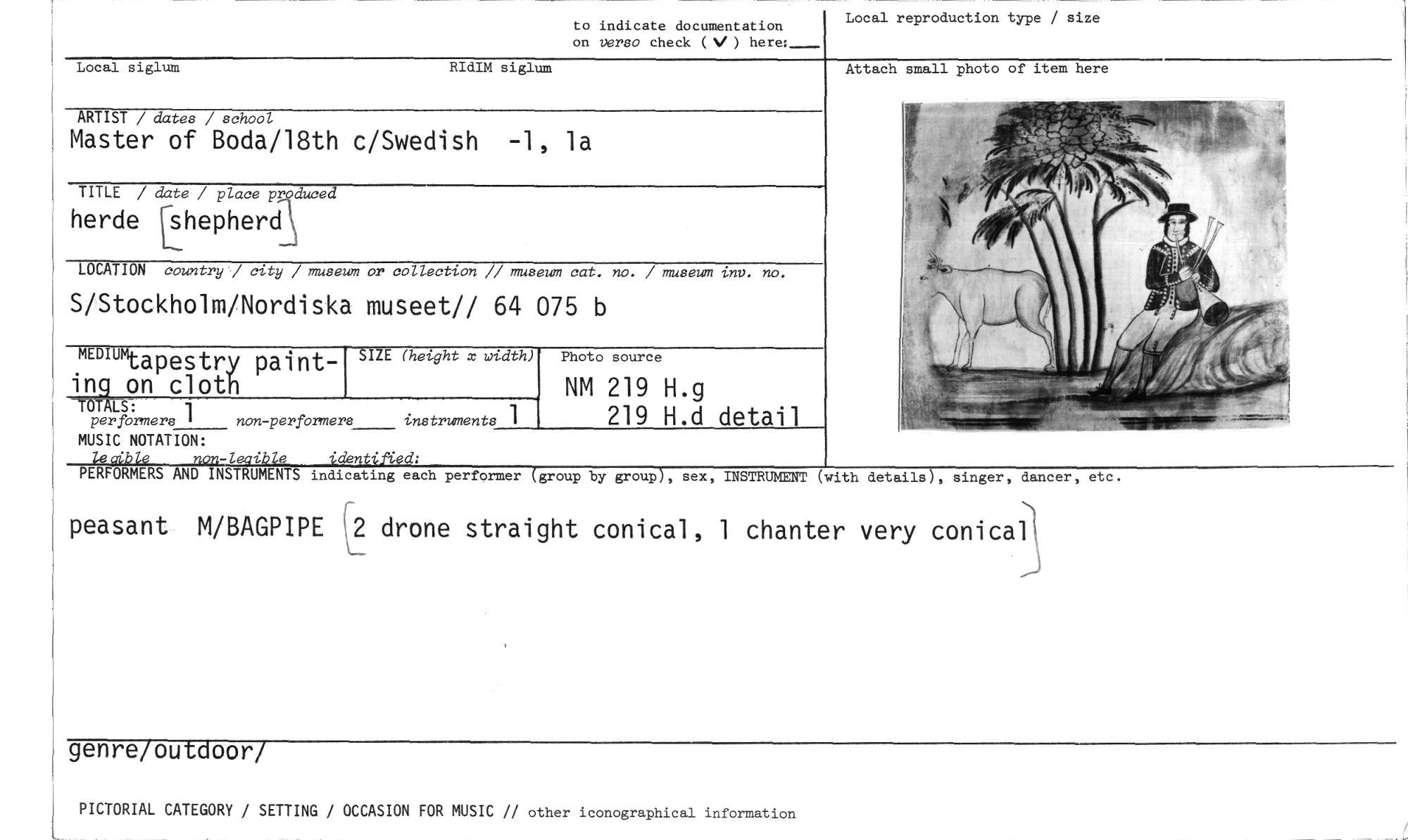 //// MUSIC NOTATION: //// uu-legible 'kienteied, //// PERFORMERS AND INSTRUMENTS indicating each performer (group by group), sex, INSTRUMENT (with details), singer, dancer, etc. //// peasant M/BAGPIPE 2 drone straight conical, 1 chanter very conicaF //// genre/outdoor/ //// PICTORIAL CATEGORY / SETTING / OCCASION FOR MUSIC // other iconographical information //// herde shepherd //// LOCATION country / city / museum or collection // museum cat. no. / museum inv. no. //// S/Stockholm/Nordiska museet// 64 075 b //// to indicate documentation //// on verso check (V) here:___ //// Local reproduction type / size //// Local siglum RIdIM siglum //// ARTIST / dates / school //// Master of Boda/18th c/Swedish -1, la //// TITLE / date / place prpduced //// '1"tapestry painting on cloth //// -TOTALS: //// performers 1 non-performers instruments //// Attack small photo of item here //// SIZE lhe,ght x width) //// Photo source //// NM 219 H.g //// 219 H.d detail ////