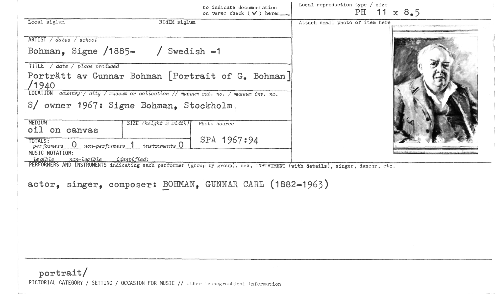 //// to indicate documentation on verso check (V) here: //// Local reproduction type / size //// PH 11 x 8.5 //// Attach small photo of item here //// Local siglum RIdIM siglum //// ARTIST / dates / school //// Bohman, Signe /1885- / Swedish -1 //// TITLE / date / place produced //// Porträtt av Gunnar Bohman [Portrait of G. Bohman] //// /1940 //// LOCATION country*/ city / museum or collection // museum cat. no. / museum inv. no. //// S/ owner 1967: Signe Bohman, Stockholm //// MEDIUM SIZE (height x width) //// oil on canvas //// SPA 1967:94 //// MUSIC NOTATION: //// per formers 0 non-performers 1 instrwnents 0 //// Photo source //// 1-•i• e den Ud, //// PERFORMERS AND INSTRUMENTS indicating each performer group by group , sex, INSTRUMENT (with details), singer, dancer, etc. //// actor, singer, composer: BOHMAN, GUNNAR CARL (1882-1963) //// portrait/ //// PICTORIAL CATEGORY / SETTING / OCCASION FOR MUSIC // other iconographical information ////