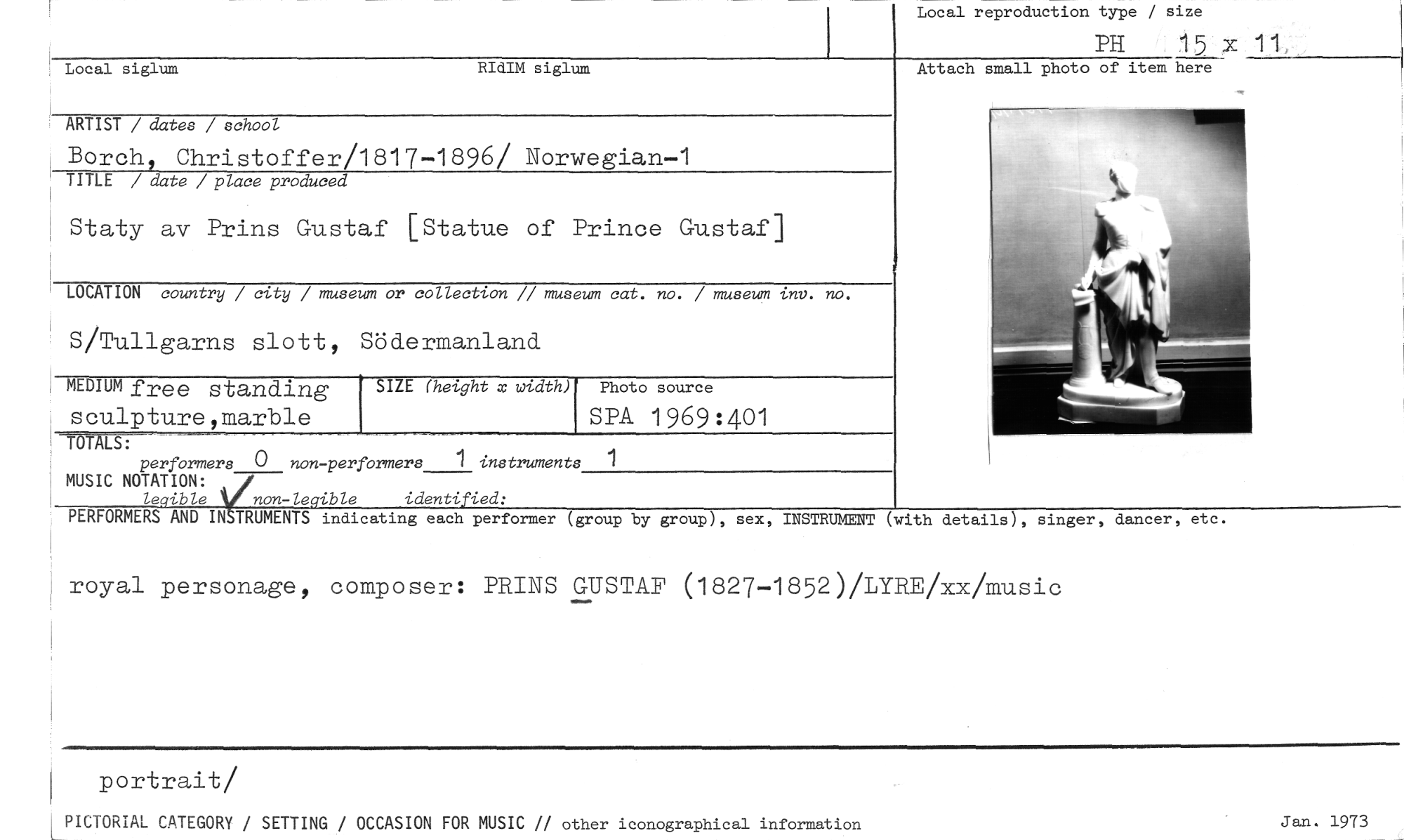 //// Local reproduction type / size //// PH 15 x 1 1 //// Local siglum //// RIdIM siglum Attach small photo of item here //// ARTIST / dates / school //// Borch, Christoffer/1817-1896/ Norwegian-1 //// TITLE / date / place produced //// Staty av Prins Gustaf [Statue of Prince Gustaf] //// LOCATION country / city / museum or collection // museum cat. no. / museum inv. no. //// S/Tullgarns slott, Södermanland //// sculpture,marble SPA 1969:401 //// performers 0 non-performers 1 instruments MUSIC NOTATION: //// le ible non-le•ible identi Ud, //// PERFORMERS AND IN TRUMENTS indicating each performer (group by group), sex, INSTRUMENT (with details), singer, //// SIZE (height x width) //// MEDIUM free standing Photo source //// dancer, etc. //// royal personage, tomposer: PRINS GUSTAF (1827-1852)/LYRE/xx/music //// portrait/ //// PICTORIAL CATEGORY / SETTING / OCCASION FOR MUSIC // other iconographical information Jan. 1973 ////
