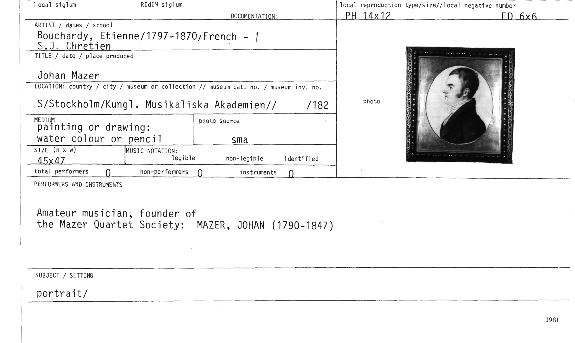 //// 1 ocal siglum RIdIM siglum local reproduction type/size//local negative number //// FD 6x6 //// photo //// DOCUMENTATION: //// ARTIST / dates / school //// Bouchardy, Etienne/1797-1870/French - i //// ChrEtien //// TITLE / date / place produced //// Johan Mazer //// LOCATION: country / city / museum or collection // museum cat. no. / museum i nv. no. //// S/Stockholm/Kungl. Musikaliska Akademien// /182 //// MEDIUM //// painting or drawing: water colour or pencil //// SIZE (h x w) MUSIC NOTATION: //// 45x47 legible non-legible i denti fi ed //// photo source //// sma //// total performers //// non-performers Q instruments 0 //// PERFORMERS AND INSTRUMENTS //// Amateur musician, founder of //// the Mazer Quartet Society: MAZER, JOHAN (1790-1847) //// SUBJECT / SETTING //// portrait/ //// 1951 ////