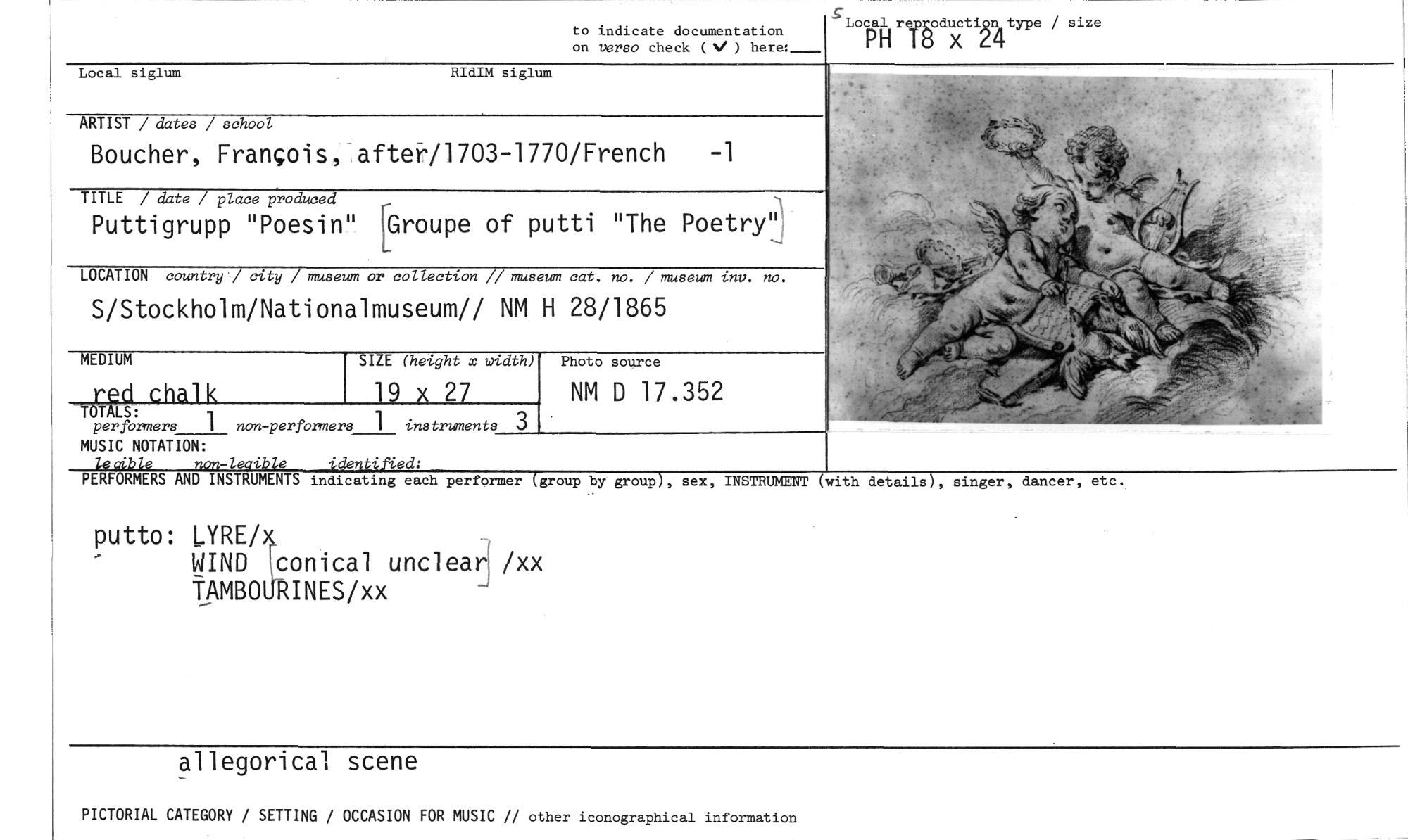 //// to indicate documentation //// on versa check (V ) here:___ //// ''Local reD,oducxtign4 type / size //// PH T8 //// Local siglum //// ARTIST / dates / school //// Boucher, Frankois, aftei11703-1770/French -1 //// TITLE / date / place produced //// Puttigrupp "Poesin" [Groupe of putti "The Poetry" //// LOCATION country / city / museum or collection // museum cat. no. / museum inv. no. //// S/Stockholm/Nationalmuseum// NM H 28/1865 //// ME I1JM //// SIZE (height x width) //// red £halk 19 x 27 //// TOTALS: //// perfbrmers 1 non-performers 1 instruments 3 //// MUSIC NOTATION: //// leoible non-leaible identified: //// Photo source //// NM D 17.352 //// PERFORMERS AND INSTRUMENTS indicating each performer (group by groupI, sex, INSTRUMENT (with details), singer, dancer, etc. //// putto: .YRE/ //// WIND honical unclead /xx TAMBO INES/xx //// allegorical scene //// PICTORIAL CATEGORY / SETTING / OCCASION FOR MUSIC // other iconographical information ////