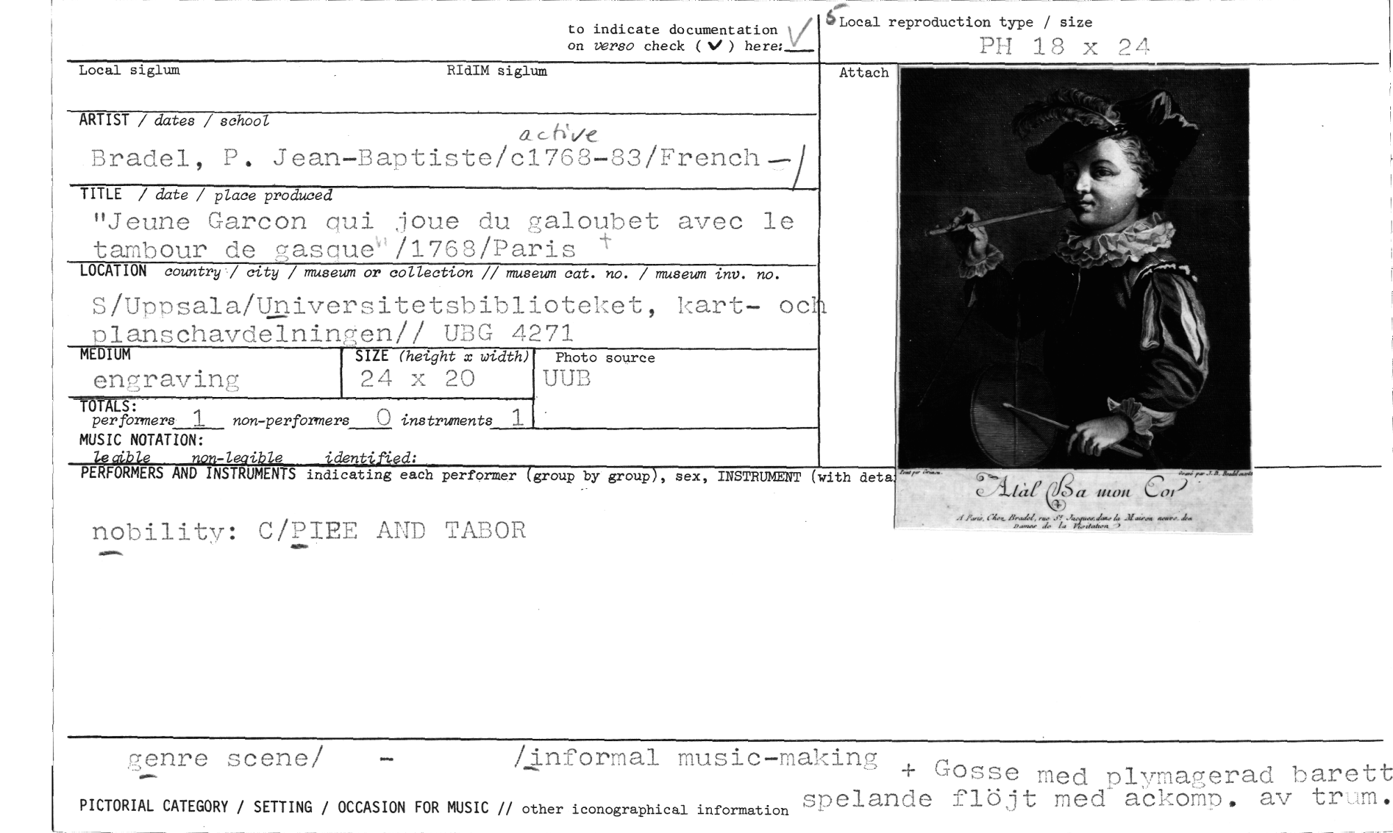 //// to indicate documentation //// on verso check ( V) here:_1 //// årLocal reproduction type / size //// Pil 13 x 24 //// Local siglum RIdIM siglum //// //// ach've //// Bradel, 2. Jean-Baptiste/c1768-83/French--/ //// TITLE / date / place produced //// "Jeune Garcon qui joue du galoubet avec le tambour de c.;',a.scue.11768/Paris //// LOCATION country •/ city / museum or collection // museum cat. no. / museum inv. no. //// S/Uppsala/Universitetsbiblioteket, 1,:art- och nlanschavdelninnten// MG 4271 //// MEDIUM SIZE (height x width) Photo source //// enp,,ravin 24 x 20 UUB //// -TÖMS: //// performers 1 non-performers C) instruments //// MUSIC NOTATION: //// non-leaible identi.Ned, //// FE FORMERS AND INSTRUMENTS indicating each performer (group by group), sex, INSTRUMENT (with deta, //// nobilitv: C/PIEE AND TABOR //// ARTIST / dates / school //// CC- 'Yhdi C/LS'a mon //// :441 //// Attach //// •enre scene/ /informal music-making //// - Gosse med nlvmagerad barett //// PICTORIAL CATEGORY / SETTING / OCCASION FOR MUSIC // other iconographical information spelande flöjt med ackomp. av ////