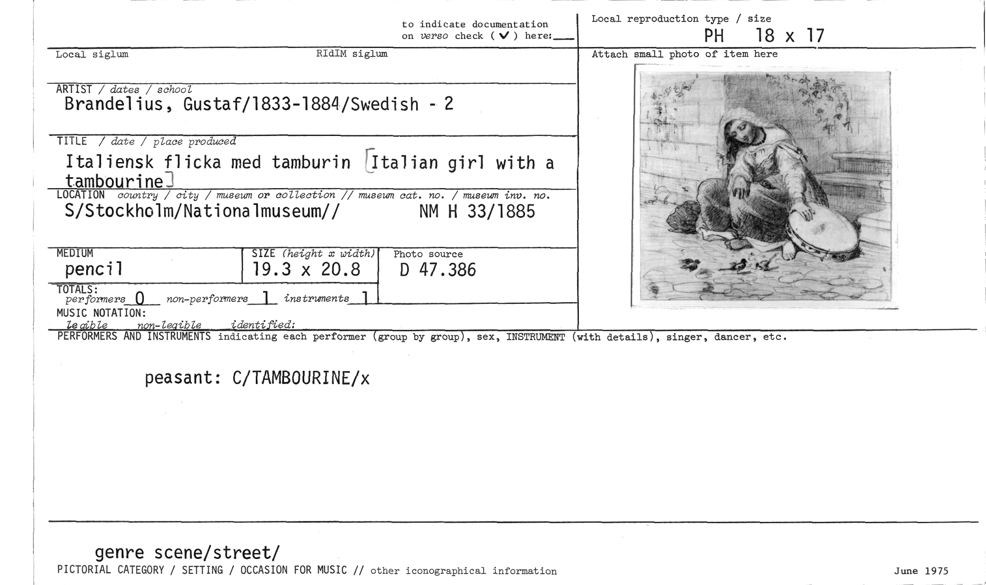 //// to indicate documentation //// on verso check ( V) here: //// Local reproduction type / size //// PH 18 x 17 //// Local siglum RIdIM siglum //// Attach small photo of item here //// k- _ //// ARTIST / dates / school //// Brandelius, Gustaf/1833-1884/Swedish - 2 //// TITLE / date / place produced //// Italiensk flicka med tamburin rItalian girl with a tambourine] //// LOCATION country / city / museum or collection // museum cat. no. / museum inv. no. //// S/Stockholm/Nationalmuseum// NM H 33/1885 //// MEDIUM SIZE (height x width) //// pencil 19.3 x 20.8 //// -TÖMS: //// per formers 0 non-perfbrmers_l_ instruments 1 MUSIC NOTATION: //// non-legib4e //// PERFORMERS AND INSTRUMENTS indicating each performer (group by group), sex, INSTRUMENT (with details), singer, dancer, etc. //// peasant: C/TAMBOURINE/x //// Photo source //// D 47.386 //// genre scene/street/ //// PICTORIAL CATEGORY / SETTING / OCCASION FOR MUSIC // other iconographical information //// June 1975 ////