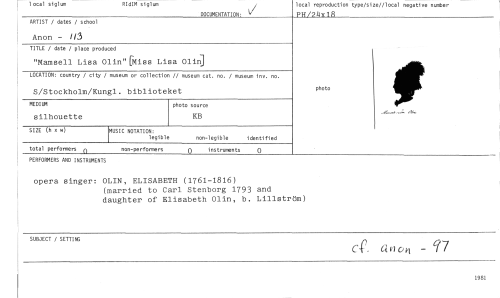//// local siglum RIdIM siglum //// DOCUMENTATION: //// local reproduction type/size//local negative number //// PH/24x18 //// ARTIST / dates / school //// Anon - 113 //// TITLE / date / place produced //// "Mamsell Lisa Olin "Miss Lisa Olin //// LOCATION: country / city / museum or collection // museum cat. no. / museum inv. no. //// S/Stockholm/Kungl. biblioteket //// MEDIUM //// silhouette //// photo source //// KB //// SIZE (h x w) //// MUSIC NOTATION: //// legible //// non-legible identified //// photo //// //// total performers 0 non-performers 0 instruments 0 //// PERFORMERS AND INSTRUMENTS //// opera singer: OLIN, ELISABETH (1761-1816) //// (married to Carl Stenborg 1793 and daughter of Elisabeth Olin, b. Lillström) //// SUBJECT / SETTING cf. ano, - 97 //// 1981 ////