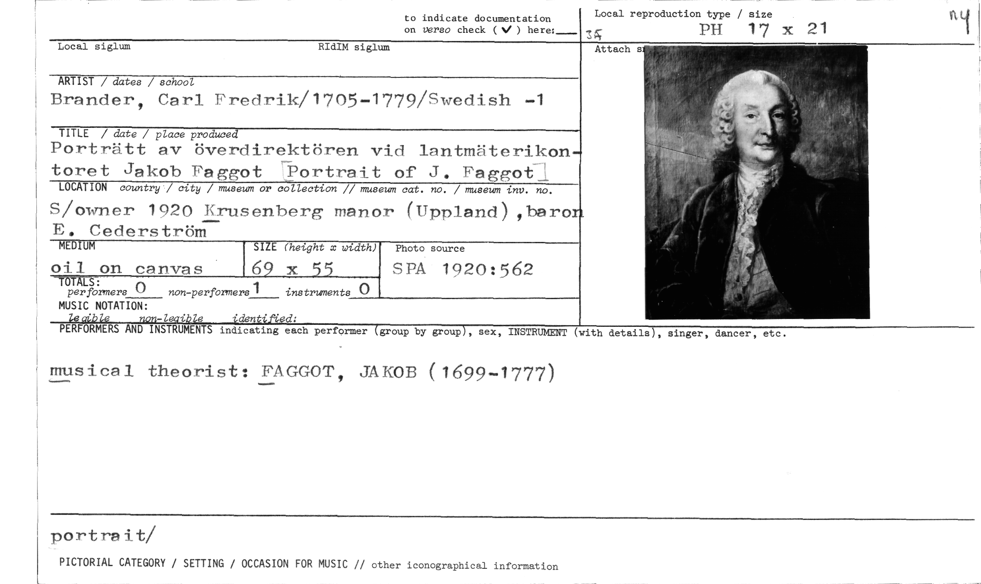 //// on versa check (V) here:__-- PH 17 X 21 //// to indicate documentation Local reproduction type / size //// Local siglum //// ARTIST / dates / school //// Brander, Carl Fredrik/1705-1779/Swedish -1 //// TITLE / date / place produced //// Porträtt av överdirektören vid lantmäterikontoret Jakob Feggot Portrait of J. Faggot_l //// LOCATION country / city / museum or collection // museum cat. no. / museum inv. no. //// S/owner 1920 Krusenberg man or ror //// E. Ceders t.r. öm //// El U //// oil on canvas //// per ormers () non-performers1 instrumen //// MUSIC NOTATION: //// non-leaible identified: //// PERFORMERS AND INSTRUMENTS indicating each performer (group by group), sex, INSTRUMENT (with details), singer, dancer, etc. //// musical theorist: FAGGOT, JAKOB (1699-1777) //// portra it/ //// PICTORIAL CATEGORY / SETTING / OCCASION FOR MUSIC // other iconographical information //// I E (height x width) //// 69 x 55 //// RIdIM siglum 1 Attach s //// 0 //// Photo source //// SPA 1920:562 ////