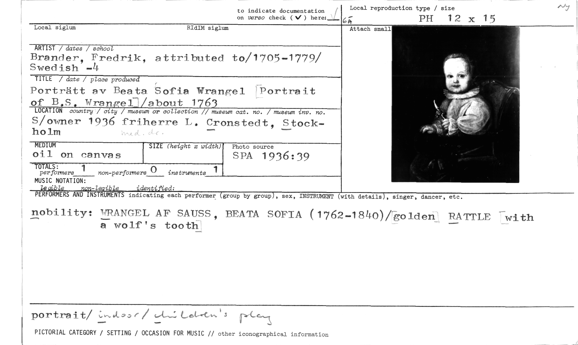 //// Local reproduction type / size //// 6i; PH 12 x 15 //// Attach small //// to indicate documentation //// on versa check (V) here: //// Local siglum RIdIM siglum //// ARTIST/dates/~ //// Brander, Fredrik, attributed to/1705-1779/ Swedish -4 //// TITLE / date / place produced //// Porträtt av Beata. Sofia Wrangel 'Portrait of B.S, Wrangei/about 1763 //// LOCATION country / city / museum or collection // museum cat. no. / museum inv. no. //// S/owner 1936 friherre L. Cronstedt, Stock- //// - //// holm //// SIZE (height x width)j Photo source //// SPA 1936:39 //// --Tures-: //// perfbrmers non-performers_l_ instruments //// MUSIC NOTATION: //// 484ble non-legible //// PERFORMERS AND INSTRUMENTS indicating each performer (group by group), sex, INSTRUMENT (with details), singer, dancer, etc. //// nobility: "RANGEL AF SAUSS, BEATA SOFIA (1762-1840)/golden RATTLE with a wolf's tooth //// portrait/ //// —^ //// PICTORIAL CATEGORY / SETTING / OCCASION FOR MUSIC // other iconographical information //// MEDIUM //// oil on canvas ////