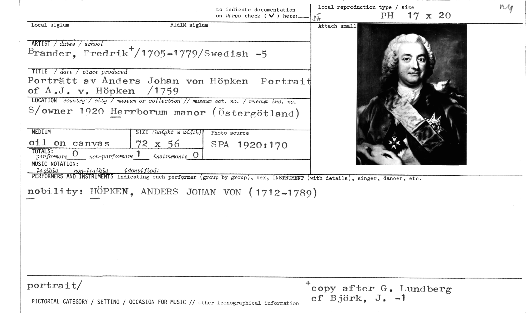 //// Local reproduction type / size //// 2,; PH 17 x 20 //// Attach small //// to indicate documentation //// on verso check (..e) here: //// Local siglum RIdIM siglum //// ARTIST / dates / school //// Brander, Predrik+/1705-1779/Swedish -5 //// TITLE / date / place produced //// Porträtt av Anders Johan von. Höpken Portrait of A.J. v. Höpken /1759 //// LOCATION country / city / museum or collection // museum cat. no. / museum inv. no. //// S/owner 1920 Herrborum manor (Östergöt land //// EDIU' //// oil on canvas //// •- rl //// perfbrmers " non-performers 1 instruments 0 //// MUSIC NOTATION: //// leoible non-leaible identified: //// E (height x width) //// 72 x 56 //// Photo source //// SPA 1920:170 //// PERFORMERS AND INSTRUMENTS indicating each performer (group by group), sex, INSTRUMENT (with details), singer, dancer, etc. //// nobility: HÖPKEN, ANDERS JOHAN VON (1712-1789) //// PICTORIAL CATEGORY / SETTING / OCCASION FOR MUSIC // other iconographical information //// portrait/ //// +copy after G. Lundberg cf Björk, J. -1 ////