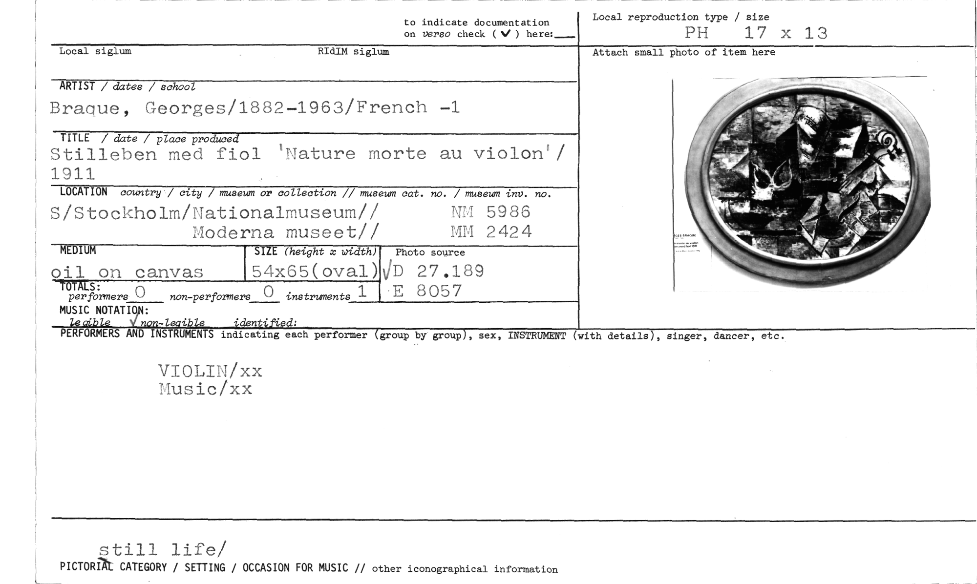 //// to indicate documentation //// on verso check (V ) here:___ //// Local reproduction type / size //// PH 17 x 13 //// Local siglum RIdIM siglum //// ARTIST / dates / school //// Braque, Georges/1882-1963/French -1 //// TITLE / date / place produced //// Stilleben med fiol 'Nature morte au violonr/ 1911 //// LOCATION country "/ city / museum or collection // museum cat. no. / museum inv. no. //// S/Stockholm/Nationalmuseumn NM 5986 //// Moderna museet!! MM 2424 //// SIZE (height x width) //// oil on canvas 54x65(oval) //// 7rxn //// performers C) non-performers //// MUSIC NOTATIO : //// Au-/ t e 'den //// MEDIUM //// instruments 1 //// Photo source //// /D 27.189 -E 8057 //// • //// Attach small photo of item here //// PERFORMERS AND INSTRUMENTS indicating each performer //// VIOLIM/xx Music/xx //// group by group • sex, INSTRUMENT (with details), singer, dancer, tc. //// still life/ //// PICTORat CATEGORY / SETTING / OCCASION FOR MUSIC // other iconographical information ////