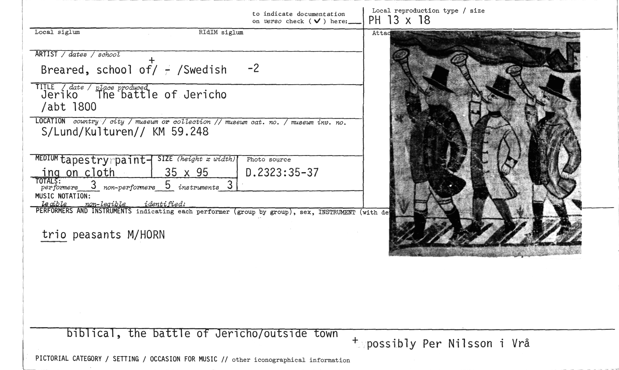 //// to indicate documentation on verso check (V ) here; //// PH 13 x 18 //// Local reproduction type / size //// Local siglum RIdIM sig um //// ARTIST / dates / school //// Breared, school of/ - /Swedish -2 //// TITLE / date /place produceaL //// Jeriko The battle of Jericho /abt 1800 //// LOCATION country / city / museum or collection // museum cat. no. / museum inv. no. //// S/Lund/Kulturen// KM 59.248 //// MEDIUM I--- //// apestryrpalnt= SIZE (height x oidth) //// iir2 on cloth 35 x 95 //// -1 e dent. //// PERFORMERS AND INSTRUMENTS indicating each performer //// Photo source //// 0.2323:35-37 //// group by group , sex, INSTRUMENT (with de //// 141- L : //// performers g non-perfOrmers 5 instruments 3 //// MUSIC NOTATION: //// trio peasants M/HORN //// . //// biblical, the battle of Jerichojoutside town possibly Per Nilsson i Vrå //// PICTORIAL CATEGORY / SETTING / OCCASION FOR MUSIC // other iconographical information ////