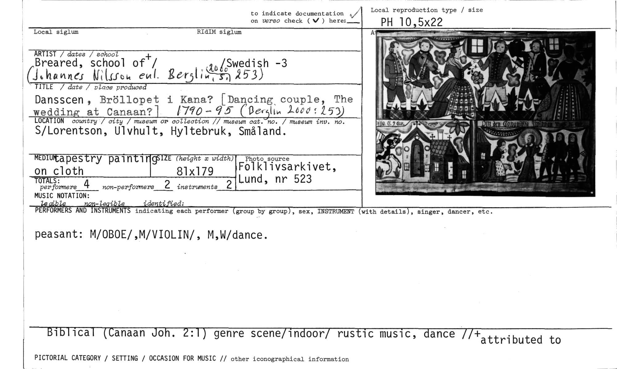 //// to indicate documentation V/ //// on verso check. ( ) here:_ //// Local reproduction type / size //// PH 10,5x22 //// Local siglum RIdIM siglum //// ARTIST / dater / school //// Breared, school of+/ .2„,/?‹edish -3 //// 0,kannei gits_rck elyl.er_51, 5-33 //// TITLE / date / aace produced //// Dansscen, Bröllopet i Kana? [Dancing couple, The wedding at Canaan?] 17q0- 95 (Derili. 16061 /5'9 //// LOCATION country / city / museum or collection // museum cat. no. / museum inv. no. //// S/Lorentson, Ulvhult, Hyltebruk, Småland. //// MEDIUbt apestry paintir //// on cloth //// -MAG: A //// performers non-performers? instruments //// MUSIC NOTATION: //// leaible non-leaible identified: //// PERFORMERS AND INSTRUMENTS indicating each performer (group by group), sex, INSTRUMENT (with detailsY, singer, dancer, etc. //// peasant: M/OBOE/,M/VIOLIN/, M,W/dance. //// Biblical (Canaan Joh. 2:1) genre scene/indoor/ rustic music, dance // //// ..1-attributed to //// PICTORIAL CATEGORY / SETTING / OCCASION FOR MUSIC // other iconographical information //// 9SIZE (height x width) //// 81x179 //// Photo source //// Folklivsarkivet, Lund, nr 523 //// • -k //// fi //// INELZ~kg.Z.;-.= //// .), ////