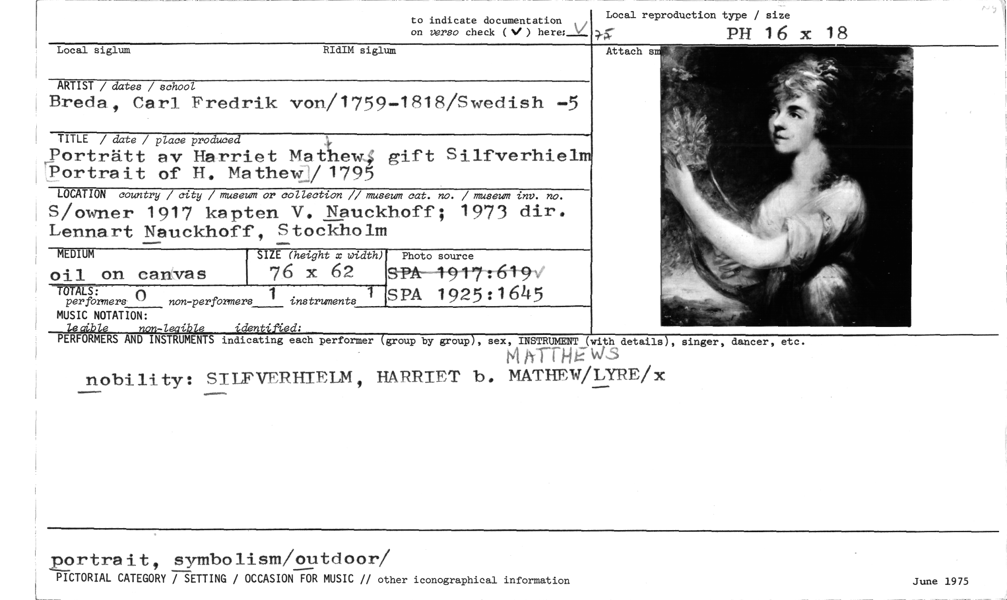 //// Local reproduction type / size //// PH 16 x //// Attack s //// 18 //// to indicate documentation //// on versa check (V ) here: Y //// Local siglum RIdIM siglum //// ARTIST / dates / school //// Breda, Carl Fredrik von/1759-1818/Swedish -5 //// TITLE / date / place produced //// Porträtt av Harriet Matilew gift Silfverhielm Portrait of H. Mathew] 1795 //// LOCATION country / city / museum or collection // museum cat. no. / museum inv. no. //// S/owner 1917 kapten V. Nauckhoff; 1973 dir. Lennart Nauckhoff, Stockholm //// MEDIUM SIZE (height x xldth) Photo source //// performers- C) non-performers 1 instruments 1 SPÄ 1925:1645 MUSIC NOTATION: //// leoibje non-legible idsotif ed: //// PERFORMERS AND INSTRUMENTS indicating each performer (group by group), sex, INSTRUMENT (with details), singer, dancer, etc. //// v45 //// nobility: SILFVERHTELM, HARRIET b. MATHEW/LYRE/x //// --- //// oil on canvas 76 x 62 S1*-4917:619, //// Ws: //// portrait, symbolism/outdoor/ //// PICTORIAL CATEGORY / SETTING / OCCASION FOR MUSIC // other iconographical information June 1975 ////
