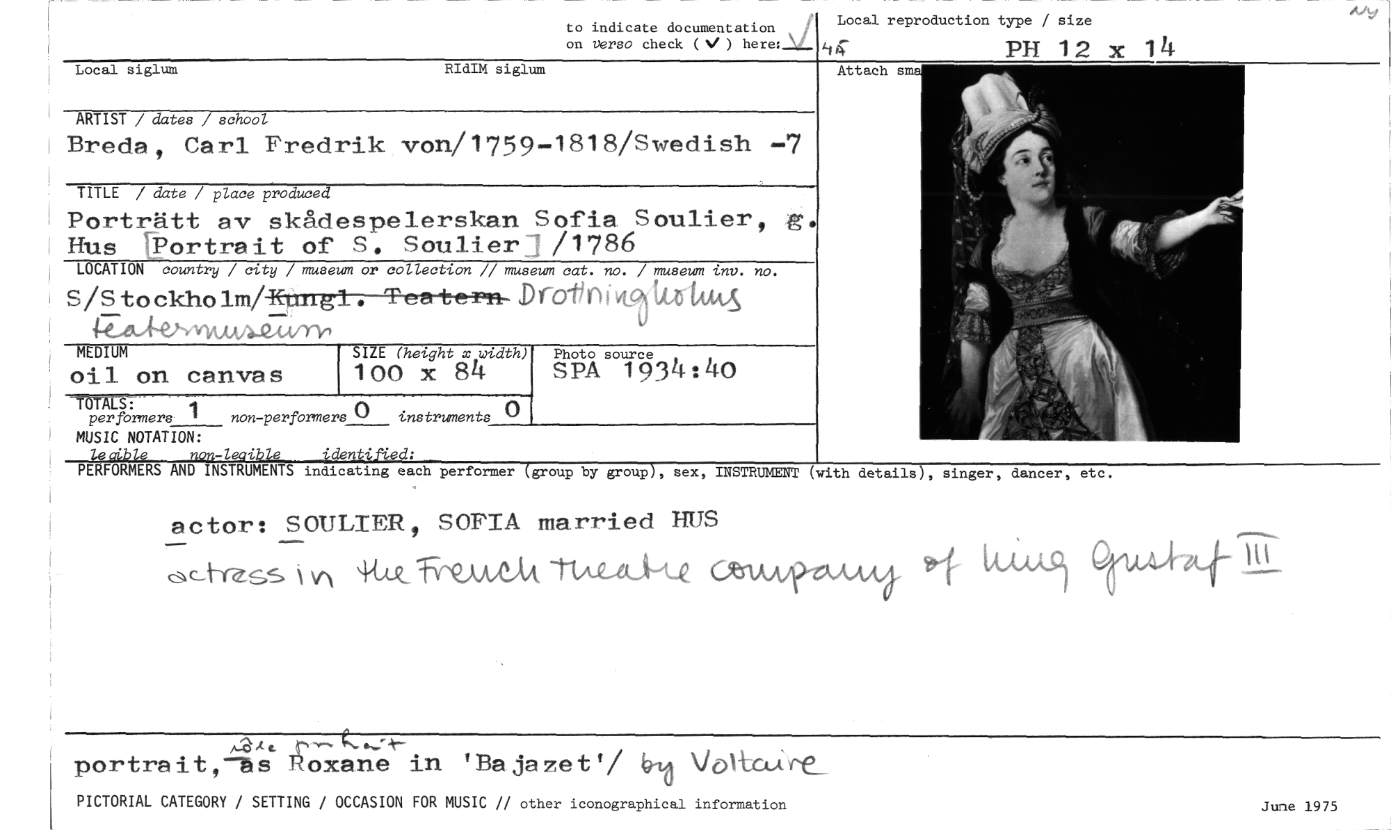 //// to indicate documentation on verso check ( %I ) here: //// Local reproduction type / size //// L14- PH 12 x //// 4 //// Local siglum RIdIM siglum //// ARTIST / dates / school //// Breda, Carl Fredrik von/1759-1818/Swedish —7 //// TITLE / date / place produced //// Porträtt av skådespelerskan Sofia. Soulier, g. //// Hus T-Por tre it of S. Soulier ] /1786 //// LOCATION country / city / museum or collection // museum cat. no. / museum inv. no. //// SiStO CkhO im/ -Yetrirgt.--Teert-~ Dr-uti') 4._( ut,z(Alts //// 4-e_41/4)-C.,ntek,4-e,tAin, //// MEDIUM SIZE (height x width) Photo source //// oil on canvas 100 x 84 SPA 1934: 4.0 //// =AM //// performere i non-perfOrmers 0 instruments //// MUSIC NOTATION: //// 494ible non-legible identi_ned, //// PERFORMERS AND INSTRUMENTS indicating each performer (group by group), sex, INSTRUMENT //// (with details), singer, dancer, etc. //// actor: SOULIER, SOFIA married HUS //// c-i--)rs5 i v\ //// portra it , --15s Roxan.e in. '13a ja zet r/ Voitc.tAr'e_ //// PICTORIAL CATEGORY / SETTING / OCCASION FOR MUSIC // other iconographical information //// June 1975 //// ////