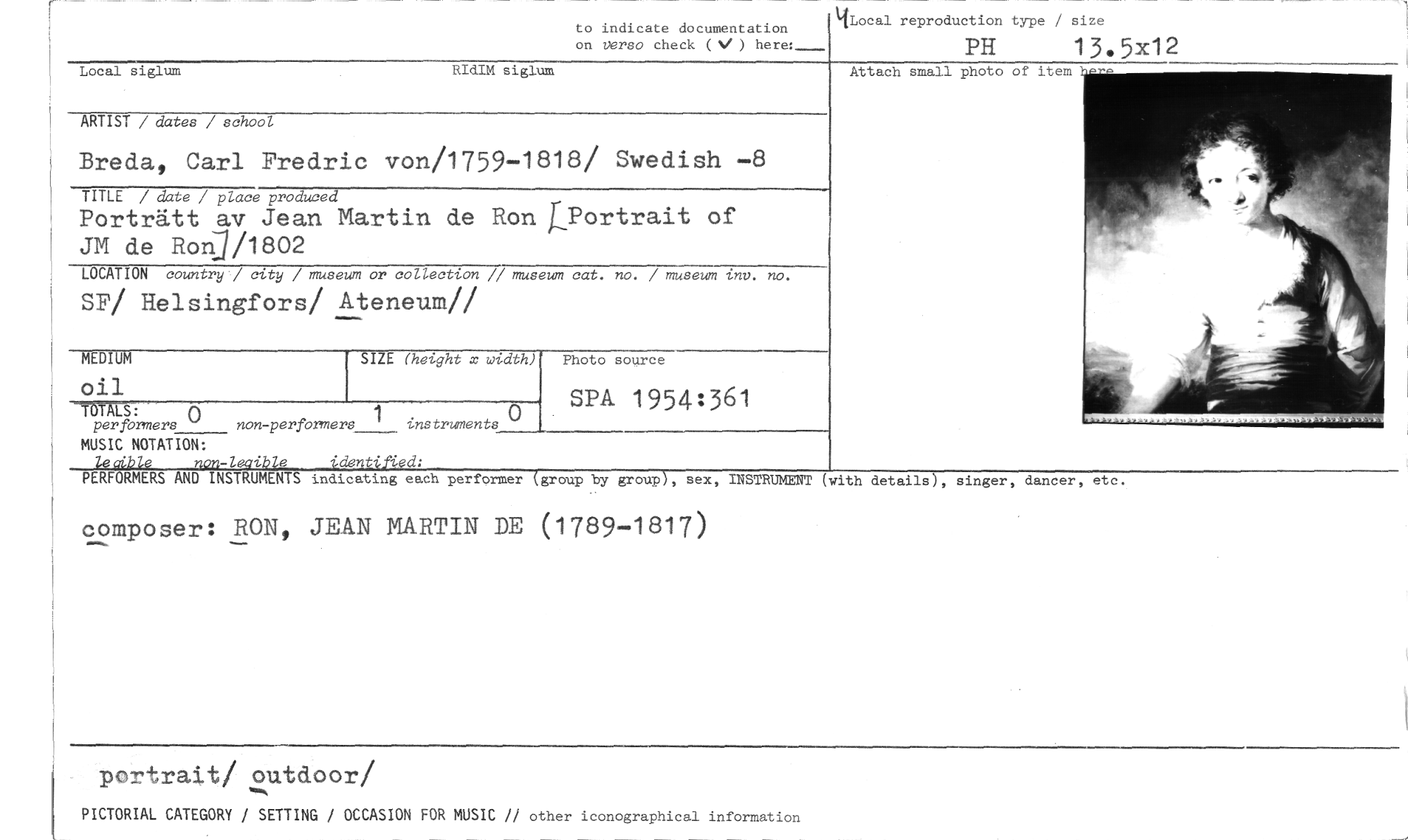 //// to indicate documentation //// on verso check ( ) here: //// Local siglum //// 4Local reproduction type / size //// PH 13.5x12 //// RIdIM siglum Attach small photo of item //// ARTIST / dates / school //// Breda, Carl Fredric von/1759-1818/ Swedish -8 //// TITLE / date / place produced //// Porträtt av Jean Martin de Ron ]lPortrait of JM de RonJ/1802 //// LOCATION country / city / museum or collection // museum cat. no. / museum inv. no. //// SF/ Helsingfors/ Ateneum// //// MEDIUM SIZE (height x width) Photo source //// 011 //// T T IS: 1 • //// performers non-perförmers___ instruments //// MUSIC NOTATION: //// ZeQible non-leaible //// PERFORMERS AND INSTRUMENTS indicating each performer (group by group), sex, INSTRUMENT (with details), singer, dancer, etc. //// composer: RON, JEAN MARTIN DE (1789-1817) //// SPA 1954:361 //// portrait/ outdoor/ //// PICTORIAL CATEGORY / SETTING / OCCASION FOR MUSIC 1/ other iconographical information ////