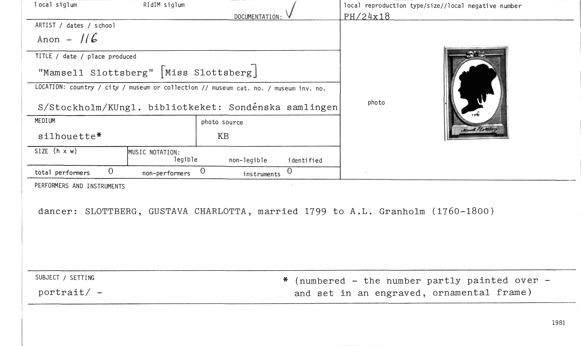 //// local siglum RIdIM siglum //// DOCUMENTATION: //// local reproduction type/size//local negative number //// PH/24x18 //// ARTIST / dates / school //// Anon — 116 //// TITLE / date / place produced //// "Mamsell Slottsberg" [Miss Slottsberg //// LOCATION: country / city / museum or collection // museum cat. no. / museum inv. no. //// S/Stockholm/KUngl. bibliotkeket: Sondenska samlingen //// MEDIUM photo source //// silhouette* KB //// SIZE (h x w) MUSIC NOTATION: non-legible identified //// legible //// total performers 0 non-performers 0 instruments //// PERFORMERS AND INSTRUMENTS //// photo //// dancer: SLOTTBERG, GUSTAVA CHARLOTTA, married 1799 to A.L. Granholm (1760-1800) //// SUBJECT / SETTING * (numbered - the number partly painted over - //// portrait/ — and set in an engraved, ornamental frame) //// 1981 ////