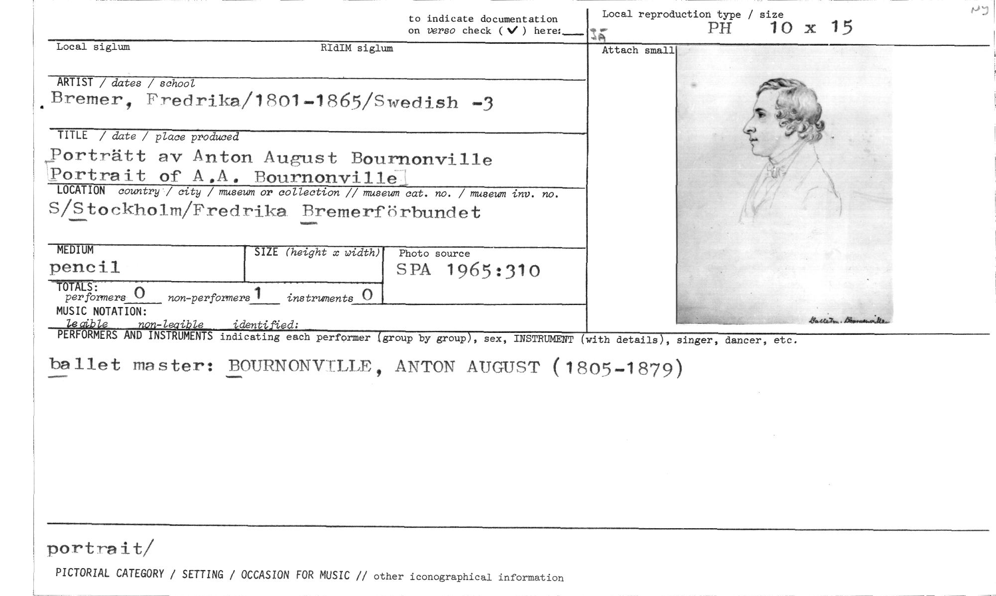 //// to indicate documentation //// on verso check ( V ) her._ //// Local reproduction type / size //// PH 10 x 15 //// Local siglum RIdIM siglum //// ARTIST / dates / school //// Bremer, Fredrika/1801-1865/Swedish -3 //// TITLE / date / place produced //// Porträtt av Anton August Bournonville Portrait of. A.A. Bour_ nonville_ //// LOCATION country / city / museum or collection // museum cat. no. / museum inv. no. //// S/Stockholm/Fredrika Bremerf8rbundet //// ••••••••^ //// Attach small //// MEDIUM //// pencil //// SIZE (height x width) //// Photo source //// SPA 1965:310 //// TOTALS //// per formers 0 non-perfoz-mers 1 instruments 0 //// MUSIC NOTATION: //// Zeaible non-leaible identified, //// PERFORMERS AND INSTRUMENTS indicating each performer (group by group), sex, INSTRUMENT (with detailsY, singer, dancer, etc. //// ballet master: BOURNONVTLLF, ANTON AUGUST (1805-1879) //// portrait/ //// PICTORIAL CATEGORY / SETTING / OCCASION FOR MUSIC // other iconographical information ////