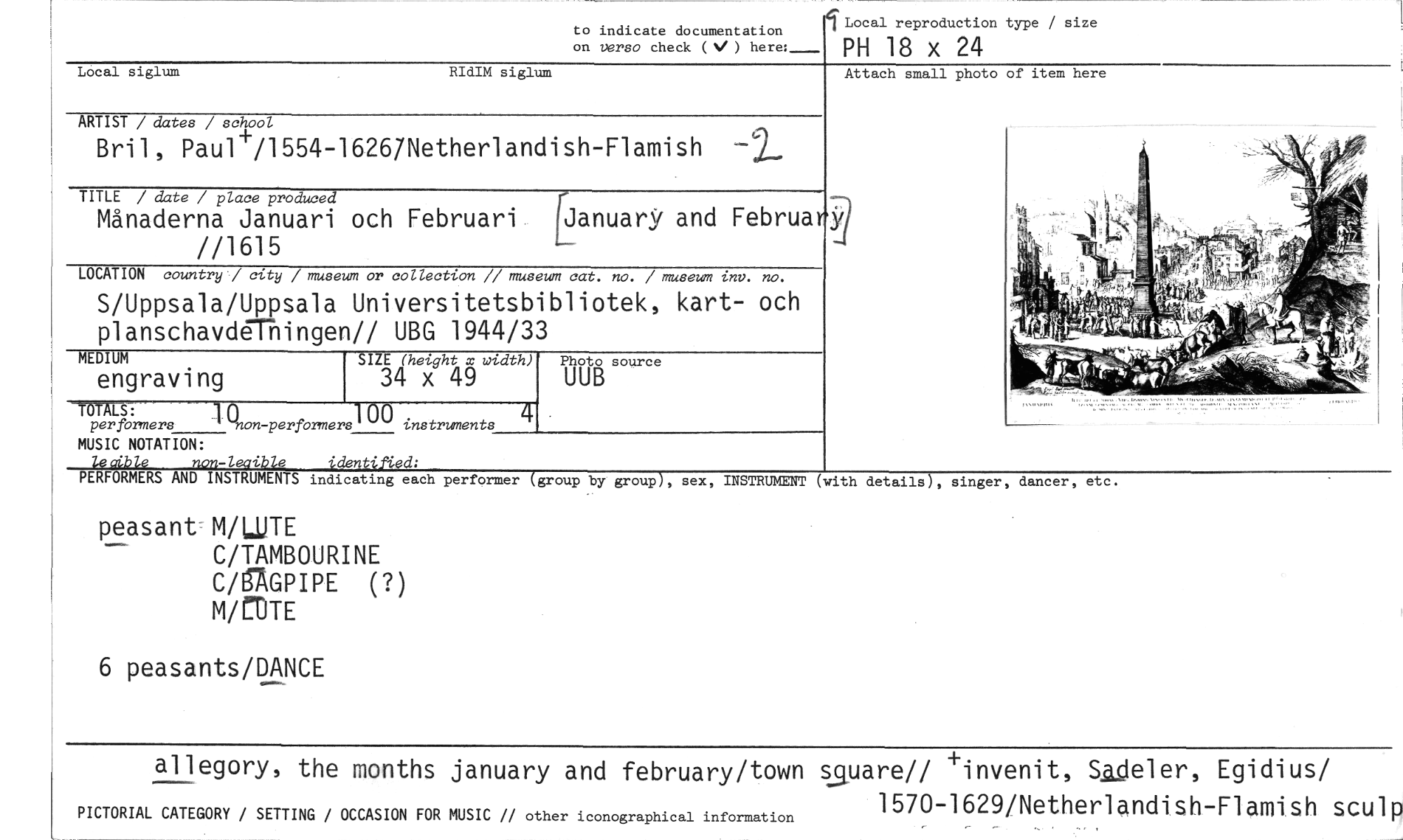 //// to indicate documentation //// on verso check ( ) here:_ //// Local reproduction type / size //// PH 18 x 24 //// Local siglum RIdIM siglum //// Attach small photo of item here //// ARTIST / dates / school //// Bril, Paul+/1554-16267Netherlandish-Flamish -2_ //// TITLE / date / place produced //// Månaderna Januari och Februari LlanuarY and Februa6] //1615 //// LOCATION country / city / museum or collection // museum cat. no. / museum inv. no. //// S/Uppsala/Uppsala Universitetsbibliotek, kart- och planschavdelningen// UBG 1944/33 //// MEDIUM - SIZE (height x width) //// engraving 34 x 49 //// =AB: 00 //// perförmers `non-perfOrmers1 instruments //// MUSIC NOTATION: //// lecible non-leaible identified: //// PERFORMERS AND INSTRUMENTS //// peasant M/ETE //// C/TAMBOURINE //// C/EgGPIPE (?) //// M/CDTE //// 6 peasants/DANCE //// allegory, the months january and february/town ssuarell +invenit, SAjeler, Egidius/ //// 1570-1629/Netherlandish-Flamish sculp //// PICTORIAL CATEGORY / SETTING / OCCASION FOR MUSIC // other iconographical information //// 4 //// source //// indicating each performer (group by group), sex, INSTRUMENT (with details), singer, dancer, etc. ////