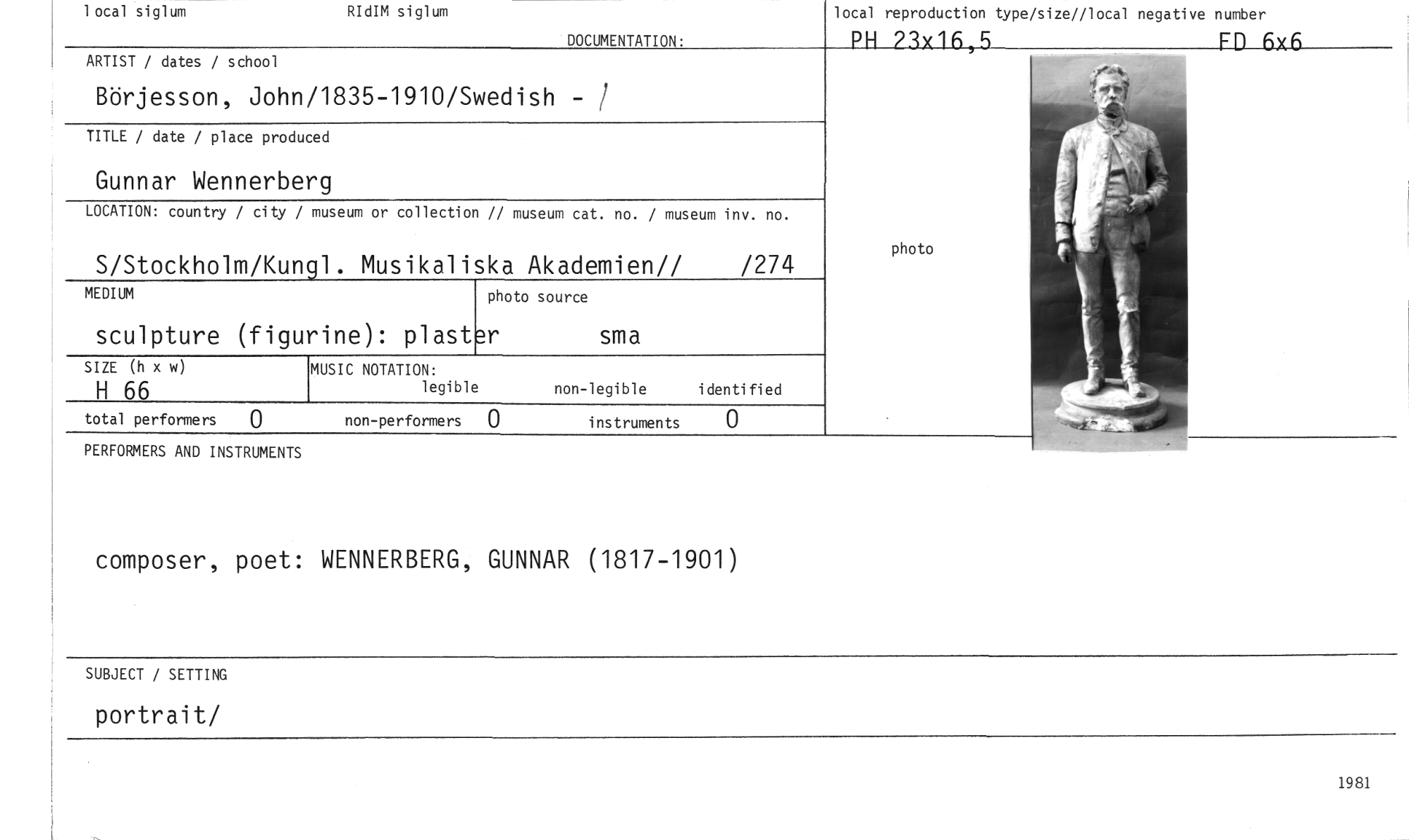 //// local siglum RIdIM siglum //// local reproduction type/size//local negative number //// PH 73x16,5 FD 6x6 //// DOCUMENTATION: //// ARTIST / dates / school //// • -4,1 4 //// photo //// Börjesson, John/1835-1910/Swedish - //// TITLE / date / place produced //// Gunnar Wennerberg //// LOCATION: country / city / museum or collection // museum cat. no. museum inv. no. //// S/Stockholm/Kungl. Musikaliska Akademien// /274 //// MEDIUM photo source //// sculpture (figurine): plast er sma //// MUSIC NOTATION: //// legible non-legible identified //// 0 non-performers 0 instruments 0 //// SIZE (h x w) //// H 66 //// total performers //// PERFORMERS AND INSTRUMENTS //// composer, poet: WENNERBERG, GUNNAR (1817-1901) //// SUBJECT / SETTING //// portrait/ //// 1981 ////