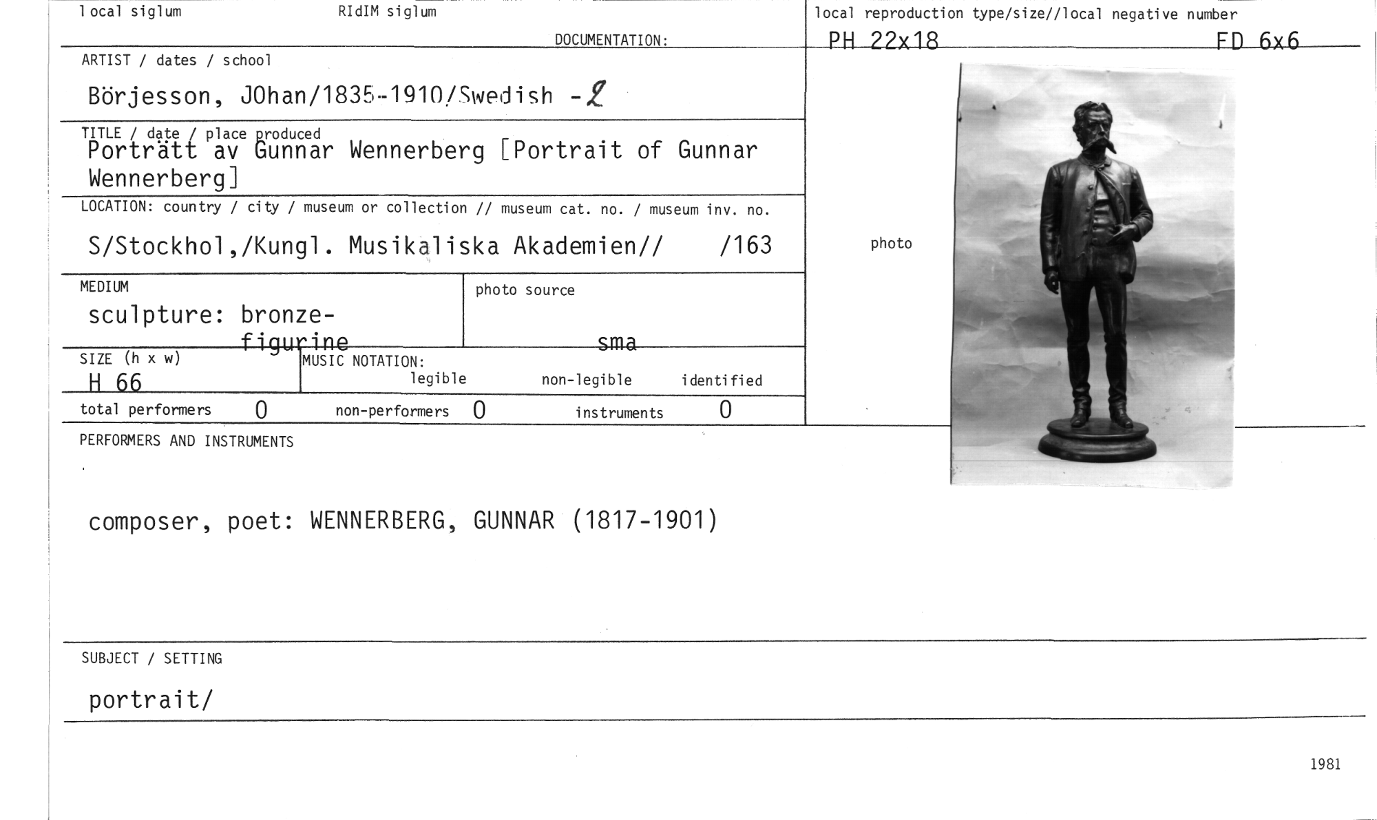 //// 1 ocal siglum RIdIM siglum //// DOCUMENTATION: //// 1 ocal reproduction type/si ze//1 ocal negative number //// PH 22x18 FD 6x6 //// ARTIST / dates / school //// Börjesson, JOhan/1835-1910.Rwedish //// TITLE / date / placeproduced //// Porträtt av Gunnar Wennerberg [Portrait of Gunnar Wennerberg] //// LOCATION: country / city / museum or collection // museum cat. no. / museum i nv. no. //// S/Stockhol,/Kungl. Musikaliska Akademien// /163 //// MEDIUM //// sculpture: bronze- //// figuline //// MUSIC NOTATION: //// legible //// total performers 0 non-performers 0 instruments 0 //// PERFORMERS AND INSTRUMENTS //// composer, poet: WENNERBERG, GUNNAR (1817-1901) //// SIZE (h x w) //// H 66 //// photo source //// sma //// non-legible i denti fi ed //// photo //// SUBJECT / SETTING //// portrait/ //// 1981 ////