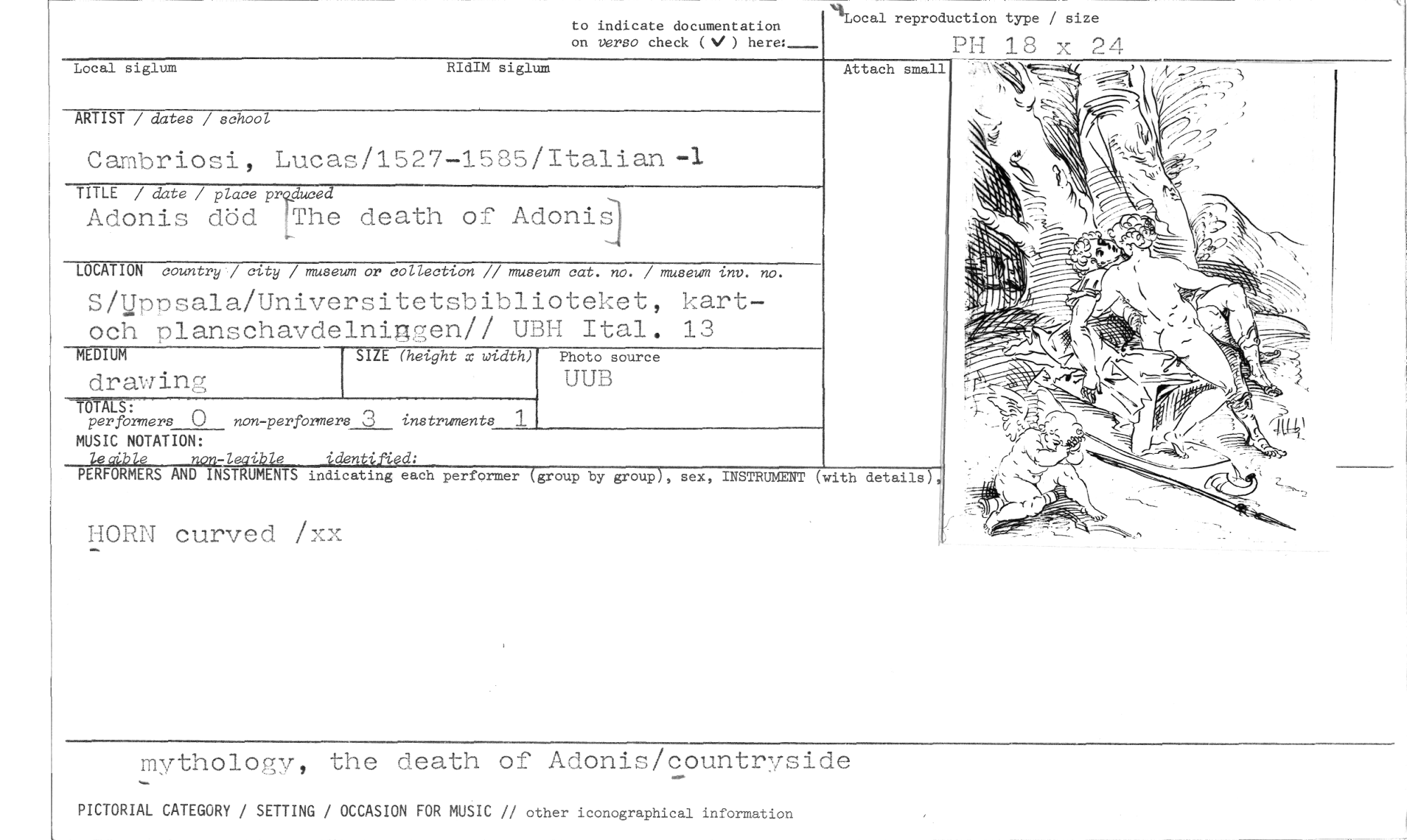 //// to indicate documentation on verso check ( V) here: //// ‘t.Local reproduction type / size //// PH 18 x 24 //// Local siglum //// ARTIST / dates / school //// Cambriosi, Lucas/1527-1585/Italian -1 //// TITLE / date / place pduced //// Adonis död T I //// he death of Adonis] //// LOCATION country / city / museum or collection // museum cat. no. / museum inv. no. //// S/Uppsala/Universitetsbiblioteket, kart-och planschavdelniggen// UBH Ital. 13 //// MEDIUM SIZE (height x width) Photo source //// drawing UUB //// -TÖTALS: //// per formers C) non-performers 3 instruments //// MUSIC NOTATION: //// e 'den //// PERFORMERS AND INST MENTS indicating each performer group by group , sex, INSTRUMENT (with details //// HORN curved /xx //// mythology, the death of Adonis/countryside - //// PICTORIAL CATEGORY / SETTING / OCCASION FOR MUSIC // other iconographical information ////