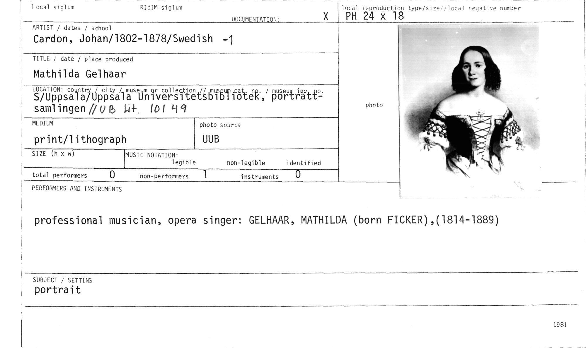 //// DOCUMENTATION: //// -1 //// ARTIST / dates / school //// Cardon, Johan/1802-1878/Swedish //// iocal siglum //// II //// RIdIM siglum //// lotal reproduction type/size//local neaative number //// X PH 24 x 18 //// TITLE / date / place produ //// Mathilda Gelhaa //// LOCATION: country/ city / //// S/Uppsala/Uppsa samt ingen // V ) //// MEDIUM //// SIZE (h x w) //// ced //// WeiVirvgilk61Surf6t4k,' pöRyisättl IDI //// photo source //// UUB //// MUSIC NOTATION: //// legible non-legible identified //// print/lithograph //// total performers non-performers 1 instruments 0 //// photo //// PERFORMERS AND INSTRUMENTS //// professional musician, opera singer: GELHAAR, MATHILDA (born FICKER),(1814-1889) //// SUBJECT / SETTING //// portrait //// 1981 ////