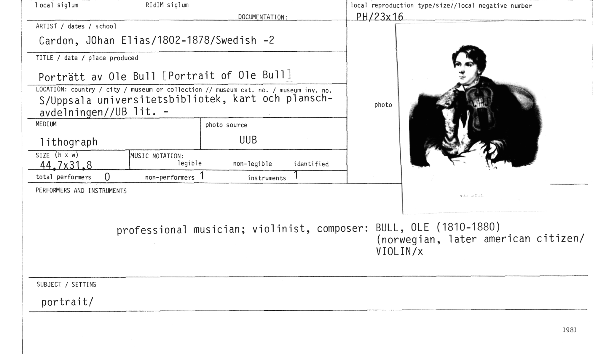 //// local siglum RIdIM siglum //// local reproduction type/size//local negative number //// PH/23x16 //// DOCUMENTATION: //// ARTIST / dates / school //// Cardon, JOhan Elias/1802-1878/Swedish -2 //// TITLE / date / place produced //// Porträtt av Ole Bull [Portrait of Ole Bull] //// LOCATION: country / city / museum or collection // museum cat. no. / museum inv. no. //// S/Uppsala universitetsbibliotek, kart och plansch- //// avdelningen//UB lit. - //// MEDIUM photo source //// lithograph UUB //// SIZE (h x w) MUSIC NOTATION: non-legible identified //// 44,7x31,8 legible //// total performers 0 non-performers 1 instruments 1 //// photo //// PERFORMERS AND INSTRUMENTS //// professional musician; violinist, composer: BULL, OLE (1810-1880) //// (norwegian, later american citizen/ //// VIOLIN/x //// SUBJECT / SETTING //// portrait/ //// 1981 ////