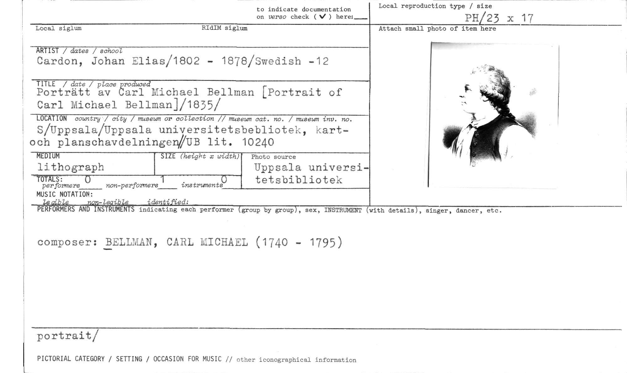 //// Local reproduction type / size //// PH/23 x 17 //// to indicate documentation //// on verso check ( ) here:_ //// Local siglum RIdIM siglum //// ARTIST / dates / school //// Cardon, Johan Elias/1802 - 1878/Swedish -12 //// TITLE /date/plampmduced //// C //// Porträtt av Carl Michael Bellman [Portrait of Carl Michael Bellman]/1835/ //// LOCATION country / city / museum or collection // museum cat. no. / museum inv. no. //// S/Uppsala/Uppsala universitetsbebliotek, kart-och planschavdelningeiiJB lit. 10240 //// MEDIUM //// lithograph //// LS: • //// per formers non-performers instruments //// MUSIC NOTATION: //// leoible non-leaible identified; //// SIZE (hetght x width) //// Photo source //// Uppsala universitetsbibliotek //// Attach small photo of item here //// 1 //// PERFORMERS AND INSTRUMENTS indicating each performer (group by group), sex, INSTRUMENT //// composer: BELLMAN, CARL MICHAEL (1740 - 1795) //// (with details), singer, dancer, etc. //// portrait/ //// PICTORIAL CATEGORY / SETTING / OCCASION FOR MUSIC // other iconographical information ////