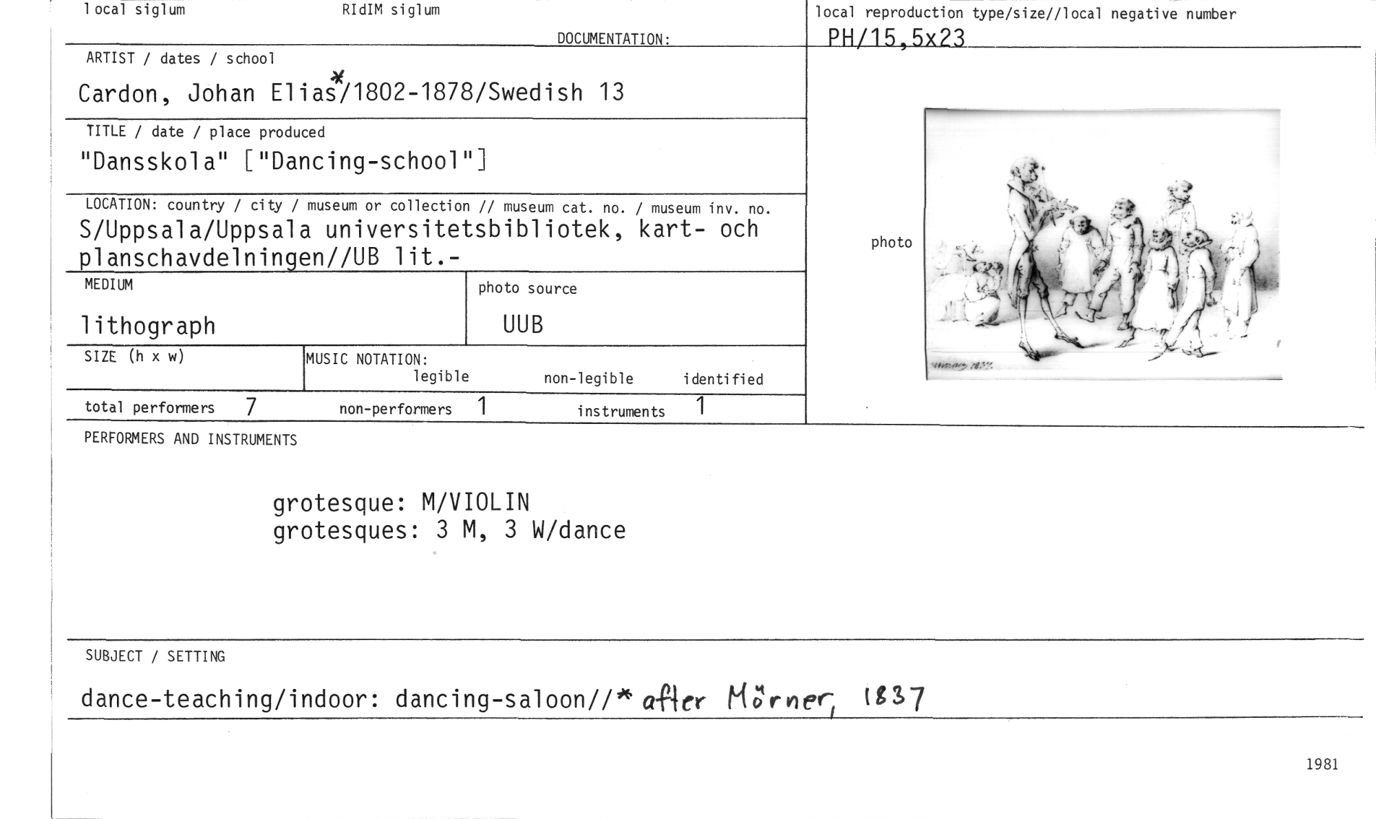 //// local siglum RIdIM siglum //// DOCUMENTATION: //// local reproduction type/size//local negative number //// PH/15,5x23 //// ARTIST / dates / school //// Cardon, Johan Elias¥ //// /1802-1878/Swedish 13 //// TULE / date / place produced //// "Dansskola" PDancing-school"1 //// LOCATION: country / city / museum or collection // museum cat. no. / museum inv. no. //// S/Uppsala/Uppsala universitetsbibliotek, kart- och planschavdelningen//UB lit.- //// photo source //// lithograph //// SIZE (h x w) //// non-legible i den d fl ed //// total performers 7 non-performers 1 instruments 1 //// MEDIUM //// UUB //// MUSIC NOTATION: //// legible //// photo //// PERFORMERS AND INSTRUMENTS //// grotesque: M/VIOLIN grotesques: 3 M, 3 W/dance //// SUBJECT / SETTING //// dance-teaching/indoor: dancing-saloon//* a44er M r n er; 1157 //// 1981 ////
