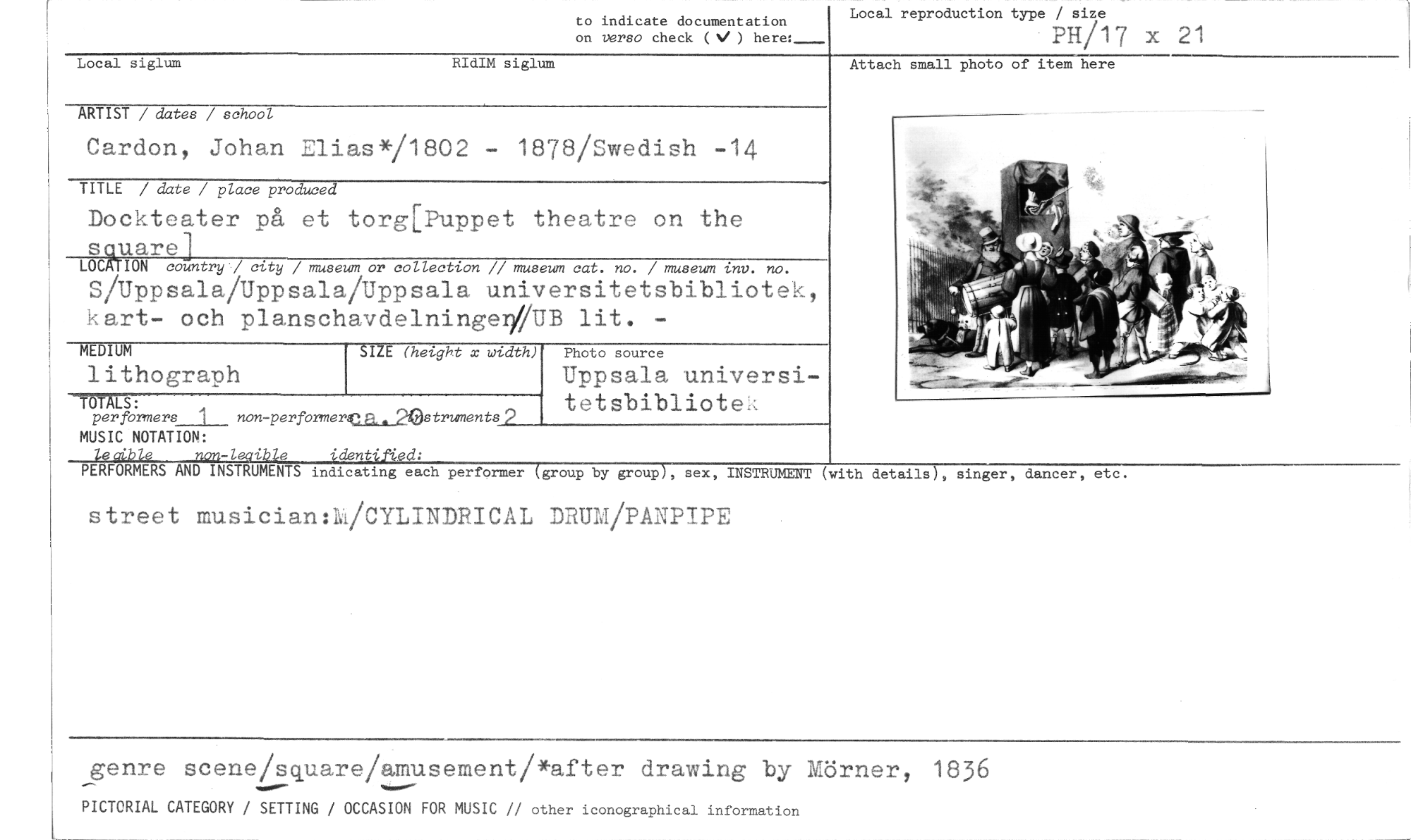 //// to indicate documentation on verso check (V ) here: //// Local reproduction type / size //// PH/17 x 21 //// Local siglum RIdIM siglum Attach small photo of item here //// //// ARTIST / dates / school //// Cardon, Johan Elias*/1802 - 1878/Swedish -14 //// TITLE / date / place produced //// Dockteater på et torg[Puppet theatre on the square] //// LOCATION country / city / museum or collection // museum cat. no. / museum inv. no. //// S/Uppsala/Uppsala/Uppsala universitetsbibliotek, kart- och planschavdelningegOB lit. - //// MUSIC NOTATION: //// leoible non-leaible identified: //// PERFORMERS AND INSTRUMENTS indicating each performer (group by group), sex, INSTRUMENT //// street musician:M/CYLINDRICAL DRUM/PANPIPE //// MEDIUM //// lithograph //// —MAUS: //// per forrners_l__ non-performereu2estrunents 2 //// Photo source //// Uppsala universitetsbibliote. //// SIZE (height x width) //// (with details), singer, dancer, etc. //// genre scene/square/amusement/*arter drawing by Mörner, 1836 //// PICTORIAL CATEGORY / SETTING / OCCASION FOR MUSIC // other iconographical information ////