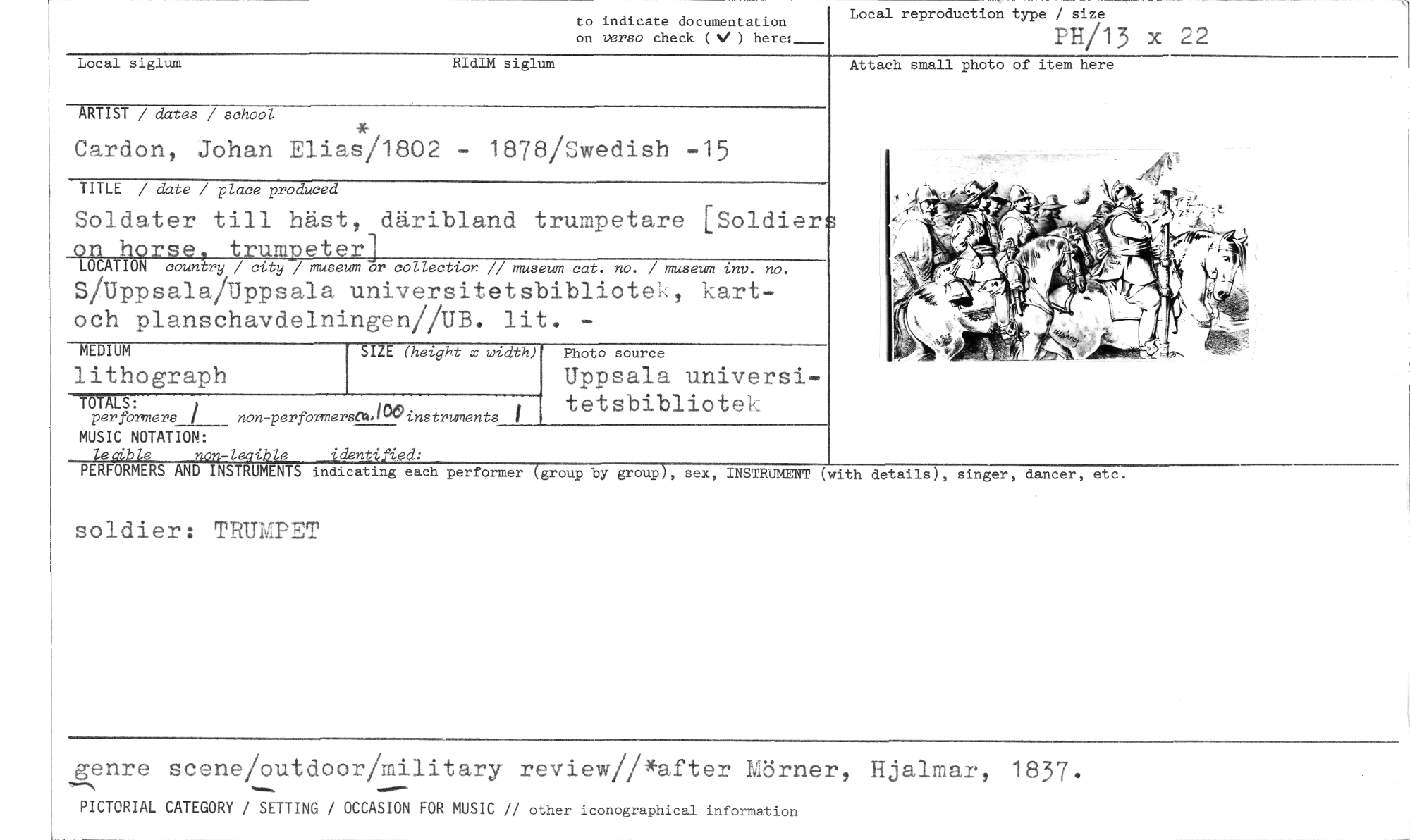//// to indicate documentation //// on verso check (N/ ) here:_ //// Local reproduction type / size //// PH/13 x 22 //// Local siglum RIdIM siglum //// ARTIST / dates / school //// Cardon, Johan Elias/1802 - 1878/Swedish -15 //// TITLE / date / place produced //// Soldater till häst, däribland trumpetare [Soldier //// on horse, trumpeter] //// LOCATION country / city / museum or collection // museum cat. no. / museum inv. no. //// S/Uppsala/Uppsala universitetsbibliotek, kart-och planschavdelningen//UB. lit. - //// SIZE (hetght x width) //// MEDIUM //// lithograph //// per formers / non-performermnbiCeinstruments 1 //// Photo source //// Uppsala universitetsbibliotek //// Attach small photo of item here //// MUSIC NOTATION: //// iai-1-•ag 'de -• //// PERFORMERS AND INSTRUMENTS indicating each performer //// soldier: TRUITET //// group by group , sex, INSTRUMENT (with de ails) singer, dancer, et //// genre scene/outdoor/military review//*after Mörner, Hjalmar, 1837• //// PICTORIAL CATEGORY / SETTING / OCCASION FOR MUSIC // other iconographical information ////
